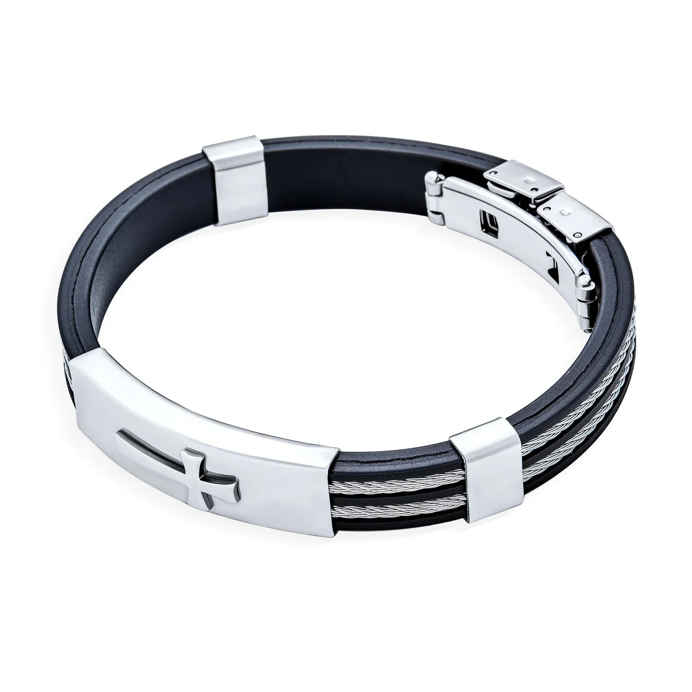 - Celebrate your religious passions with this exquisite men's identification bracelet featuring a black silicone band, stainless steel accents, and a holy cross inscribed on the rectangular name id tag.