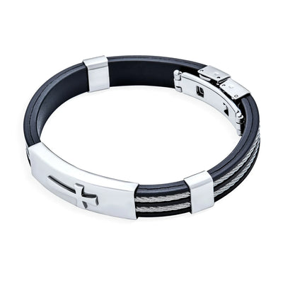 - Featuring five rows alternating between cable stainless steel and black rubber rows, stainless steel ID bar with cross at center. Fold Over Clasp.