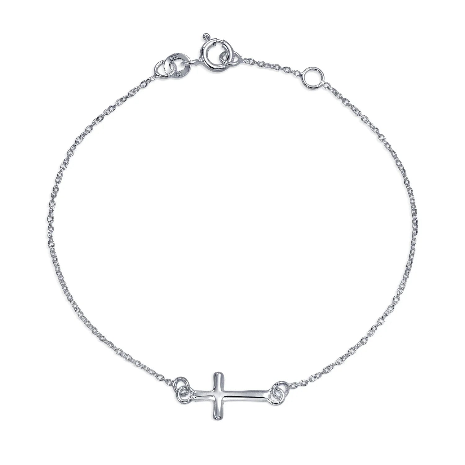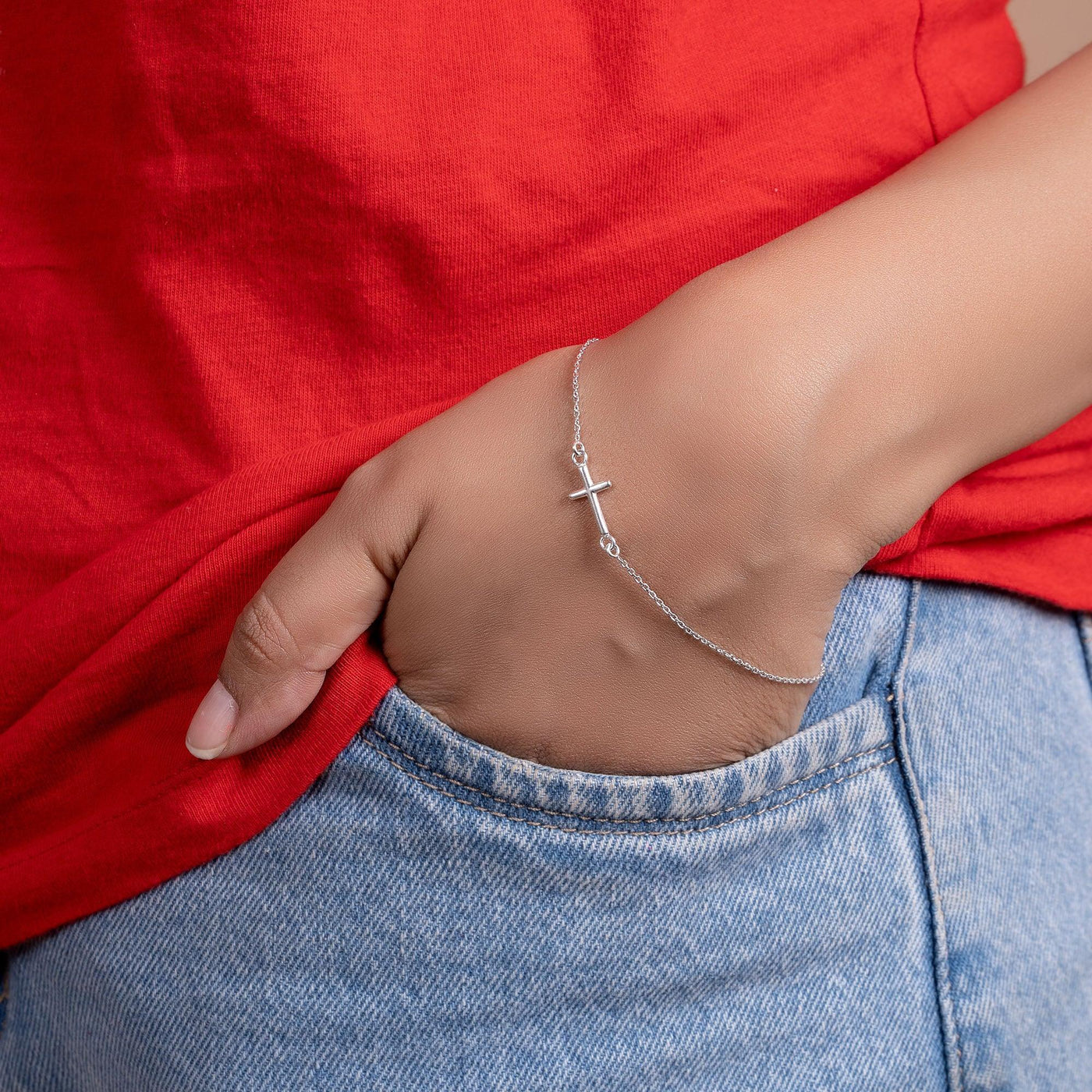 - Add subtle spirituality to your wrist with our sideways cross silver charm bracelet. This cross jewelry makes a meaningful gift. Perfect for women and young ladies who love dainty, spiritual jewelry. Our sterling silver bracelet is delicate, lightweight, and comfortable. It measures 7 inches with a half-inch extender for various wrist sizes. Give an affordable Christmas jewelry gift to friends and relatives.