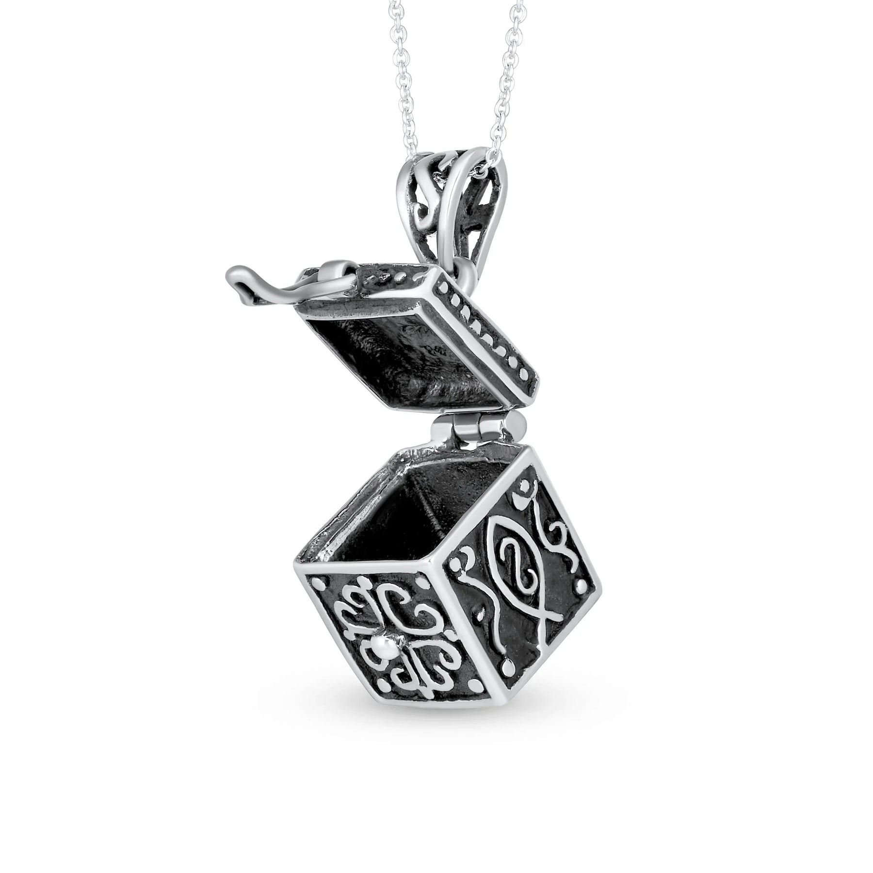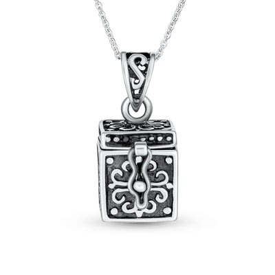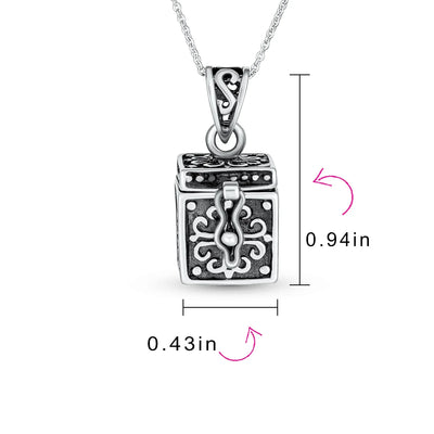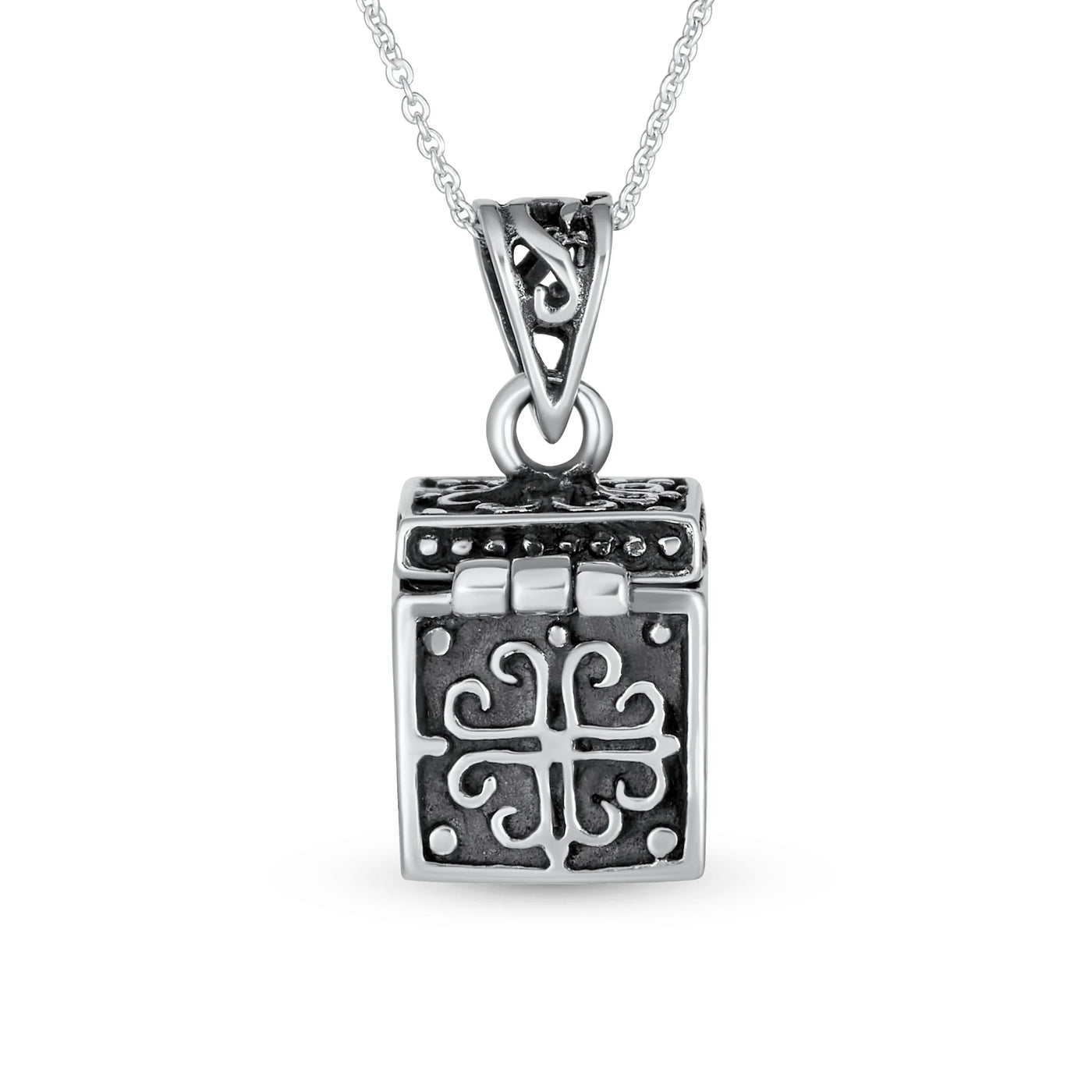• Introducing our .925 Silver Antique Style Poison Prayer Box Cross locket Pendant, a captivating and mysterious piece of jewelry. This exquisite treasure box measures less than one inch square, perfect for your cherished mementos. Prayer boxes have been cherished for centuries, and our pendant is no exception. Its highly inspirational and personal nature makes it a beautiful and exotic locket. The intricate design features an ornate cross and fish, adding Celtic charm to this enchanting piece. Not only is this pendant a stunning accessory, but it also holds sentimental value. Many close friends and family members wear matching prayer box necklaces, symbolizing their bond and shared beliefs. Surprise your loved ones with this meaningful gift. Purchase a supply of jewelry box necklaces today and show them how special they are. Whether for a birthday, anniversary, or just because, this pendant makes a lasting impression.