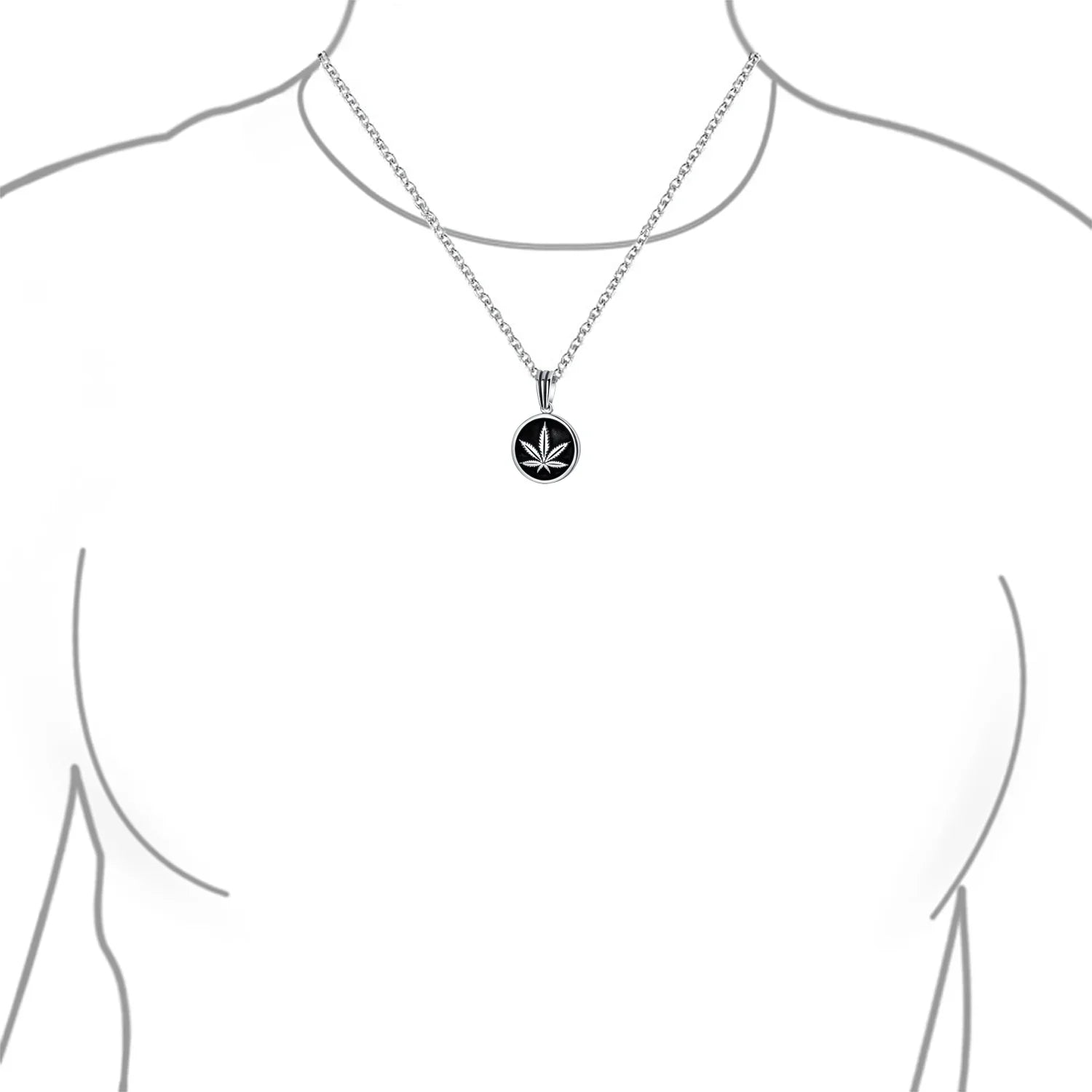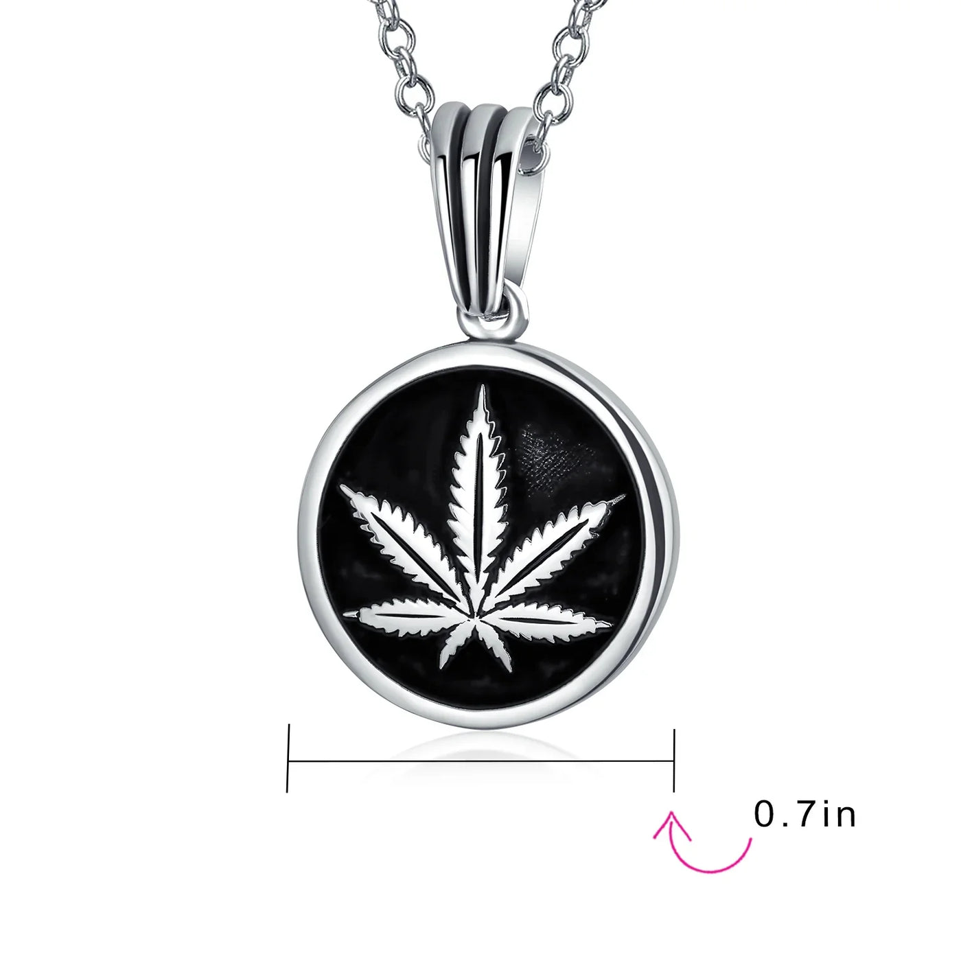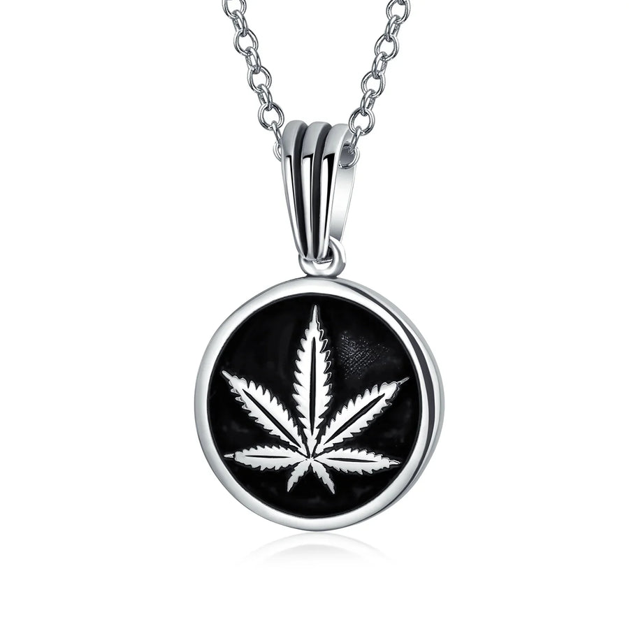 - Our silver pot leaf necklace is crafted from blackened oxidized .925 Sterling Silver. The distinct marijuana cannabis leaf design adds flair. This .925 Sterling Silver raised marijuana leaf circle pendant necklace is eye-catching. Comes with an 18-inch chain.