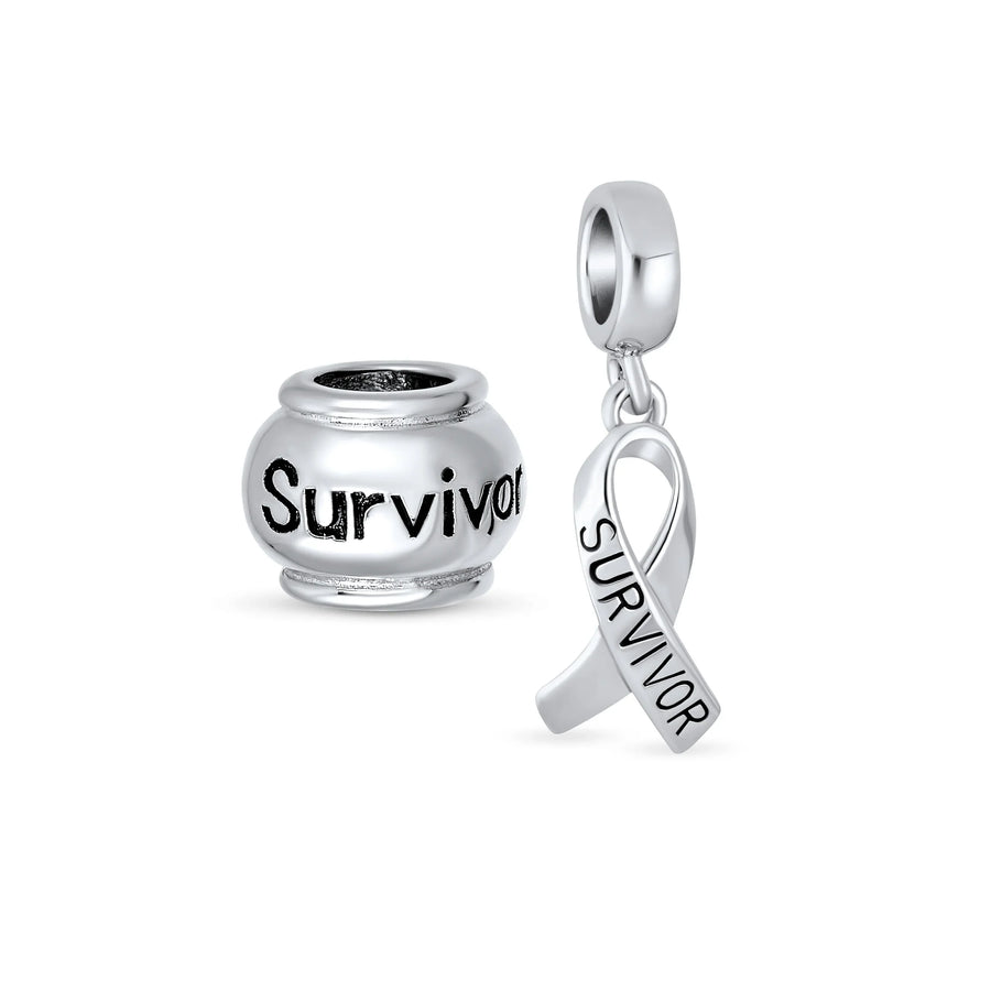 - Add these sterling silver cancer survivor charms to your bracelet collection. Featuring pink ribbons, they are interchangeable with other charms. Made from .925 sterling silver, these delicate beads make a big statement. Collecting beads and charms is trendy, so add this meaningful cancer awareness bead. Engraved with "SURVIVOR," these beads are both fashionable and inspirational. Order your sterling silver cancer survivor charm today!