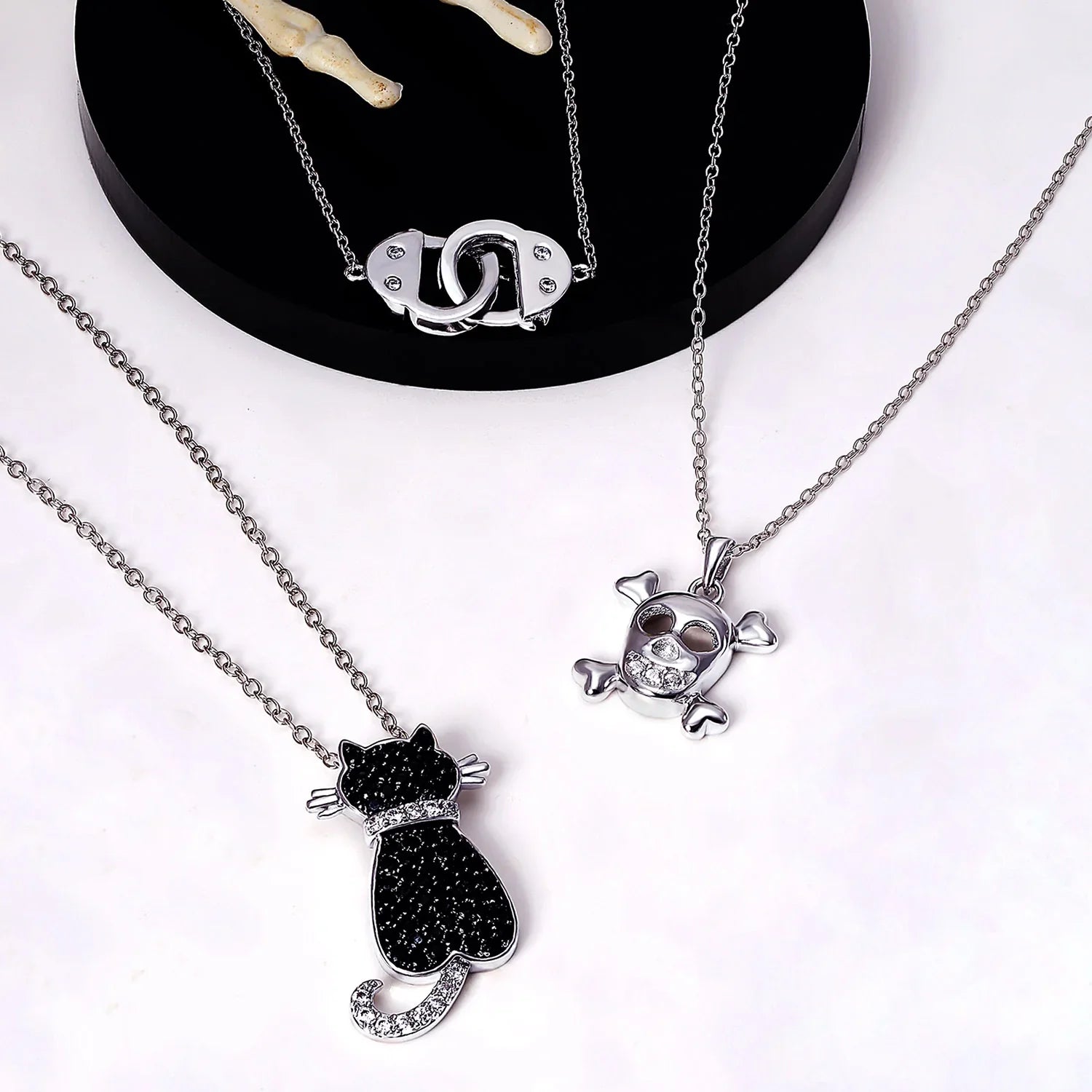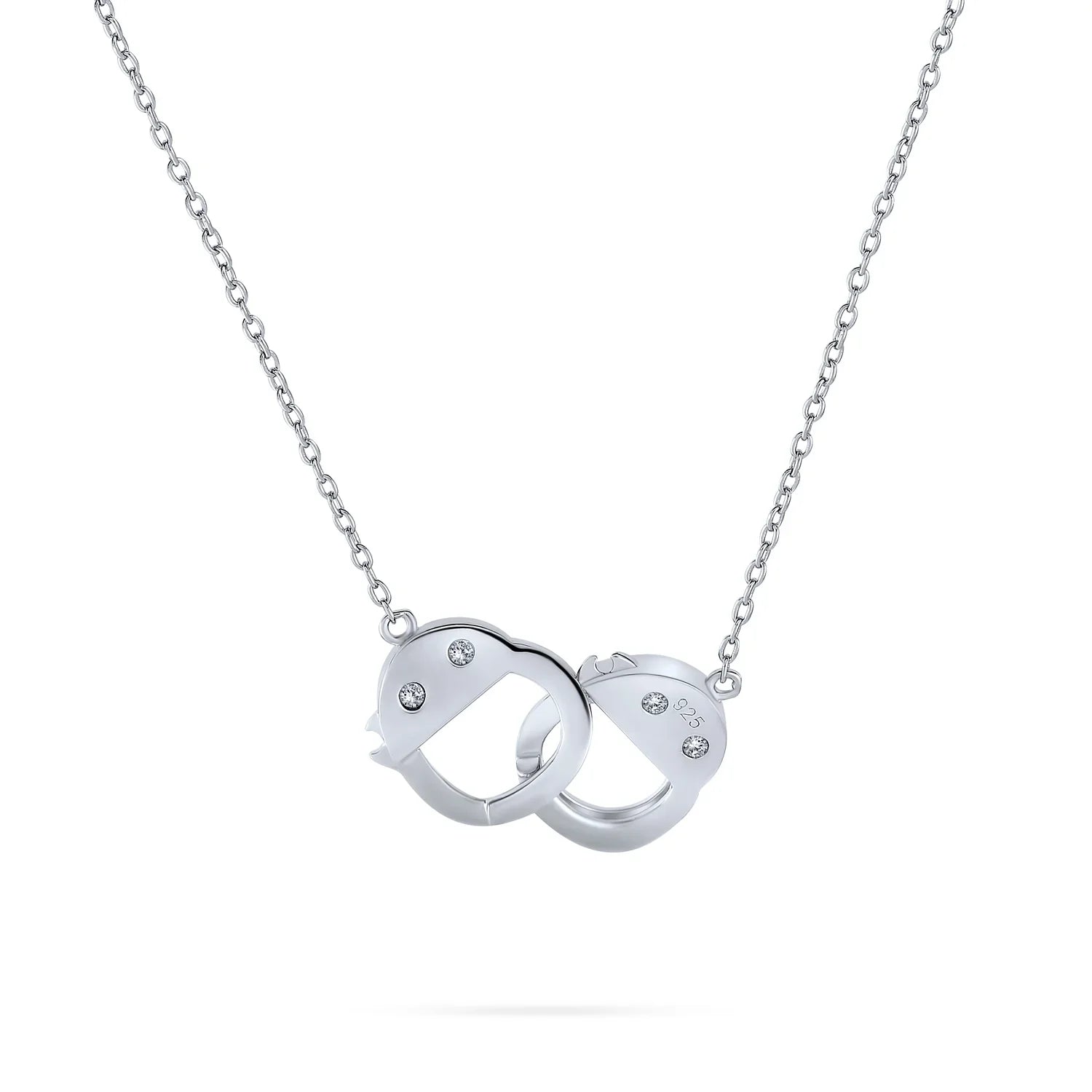• Turn heads with our .925 Sterling Silver handcuff necklace. Add Gothic edginess to your style. Features two .925 Sterling Silver handcuffs with Cubic Zirconia accents. Join the latest celebrity trend. Secure lobster claw clasp ensures durability. Elevate your fashion game today.