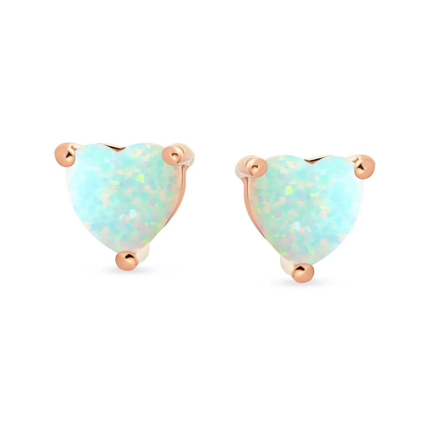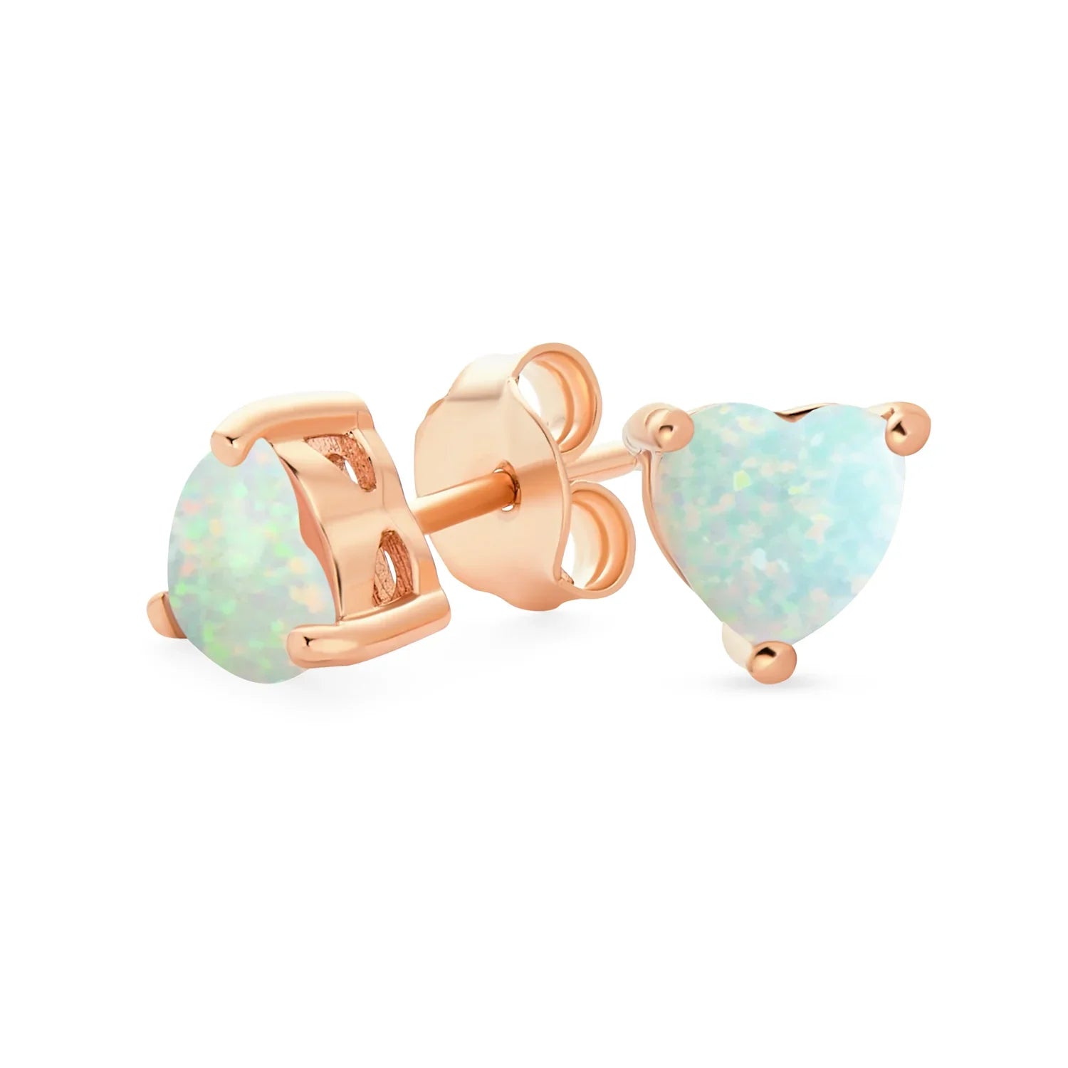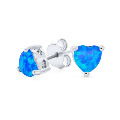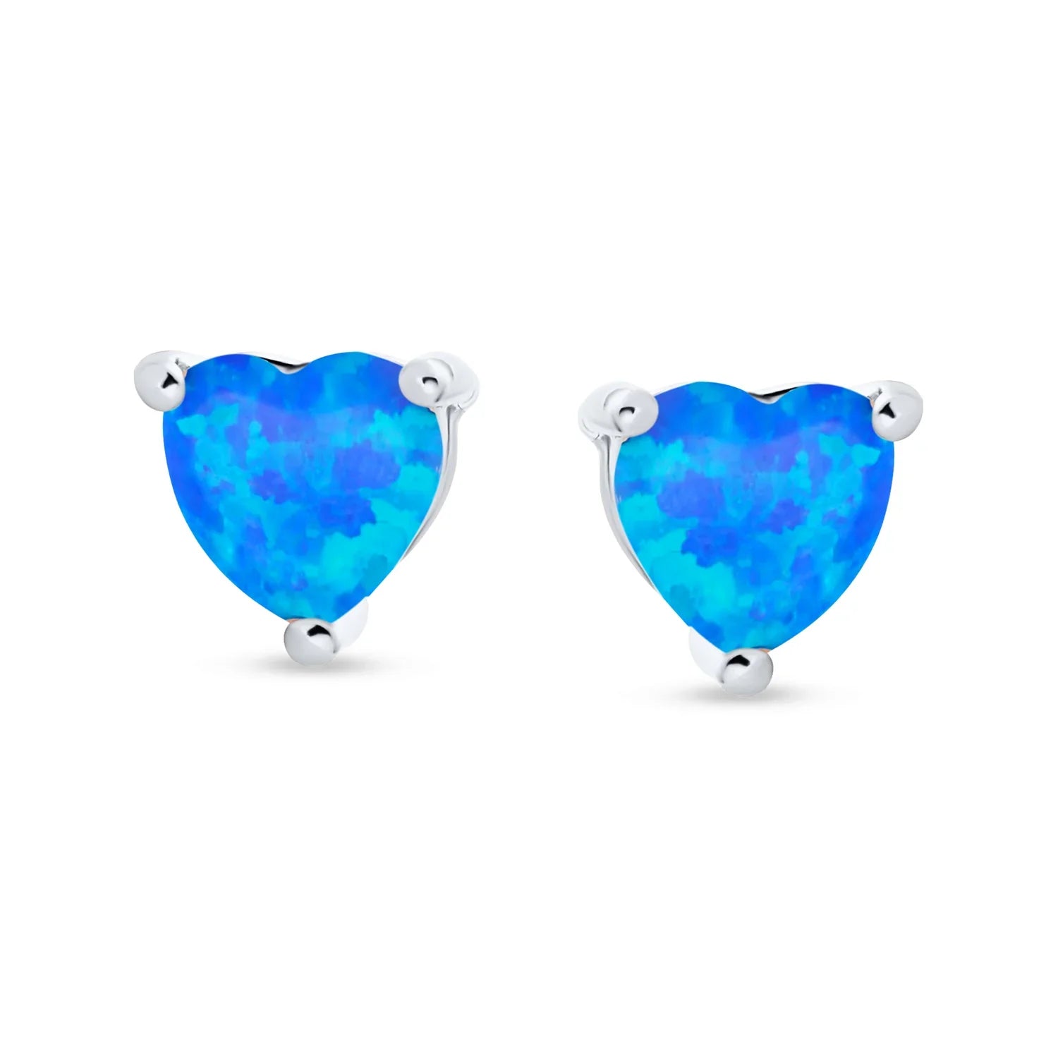 - Add a touch of love and elegance with sterling silver Created Opal heart stud earrings. Perfect for Valentine's Day or any occasion. These sterling silver synthetic Opal heart earrings make her feel special. The timeless design completes her fashionable look. Made of 925 sterling silver and rhodium plated for lasting shine. Lightweight at 2.7 grams, comfortable to wear. Secure with a post backing. Ideal for blue jewelry lovers with pierced ears. Order today for a thoughtful gift.