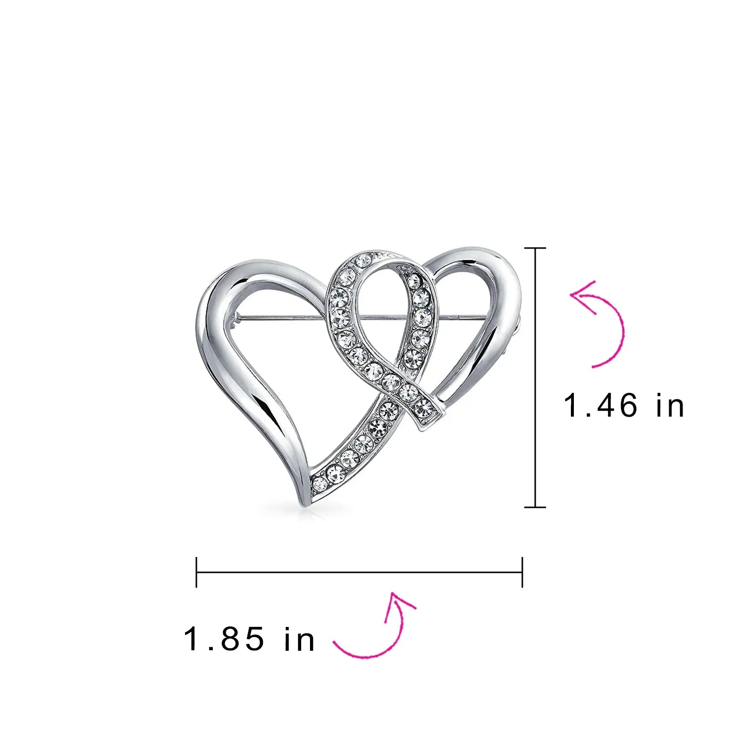 - Feel the love with our stunning Double Open Ribbon hearts Crystal Valentines Brooch Pin. Crafted from rhodium plated alloy for extra shine and tarnish resistance. Features two intertwined open hearts in a ribbon design. Adorned with small round clear crystals for a dazzling look. Perfect for Valentine's Day, bridal parties, or any special occasion. This chic and affordable brooch will elevate your style. Makes a thoughtful gift for Valentine's Day or Mother's Day. Show your love with this sparkling heart brooch pin.