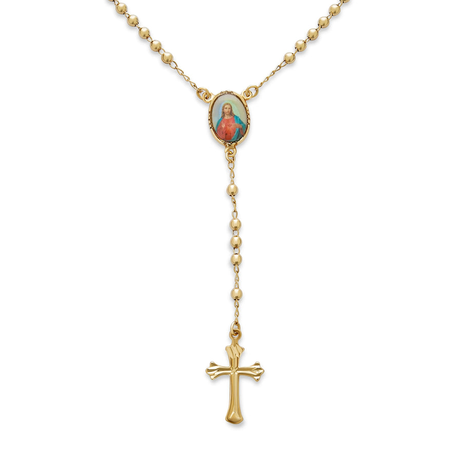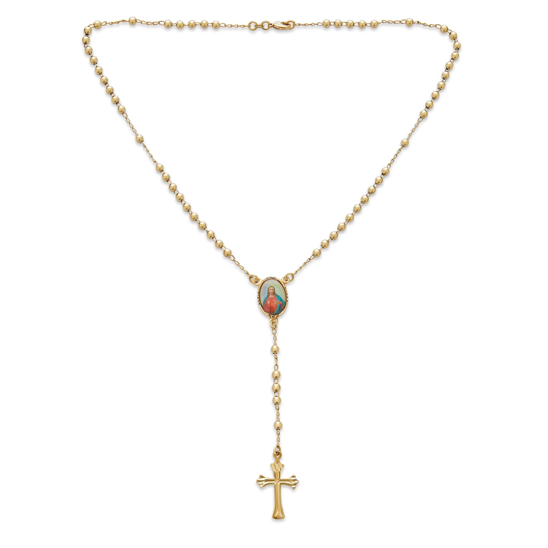 - Searching for a unisex Christian jewelry piece? Discover our beaded rosary necklace. Crafted with 18k Gold Plated Brass, it's lightweight and comfortable. Secured with a lobster claw clasp, it features a vibrant Sacred Heart of Jesus. Perfect for women of all ages, ideal for Christmas or Easter jewelry. A meaningful gift for those who cherish religious necklaces. Pair with other men's 18k Gold Plated Brass jewelry for a trendy layered look.