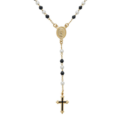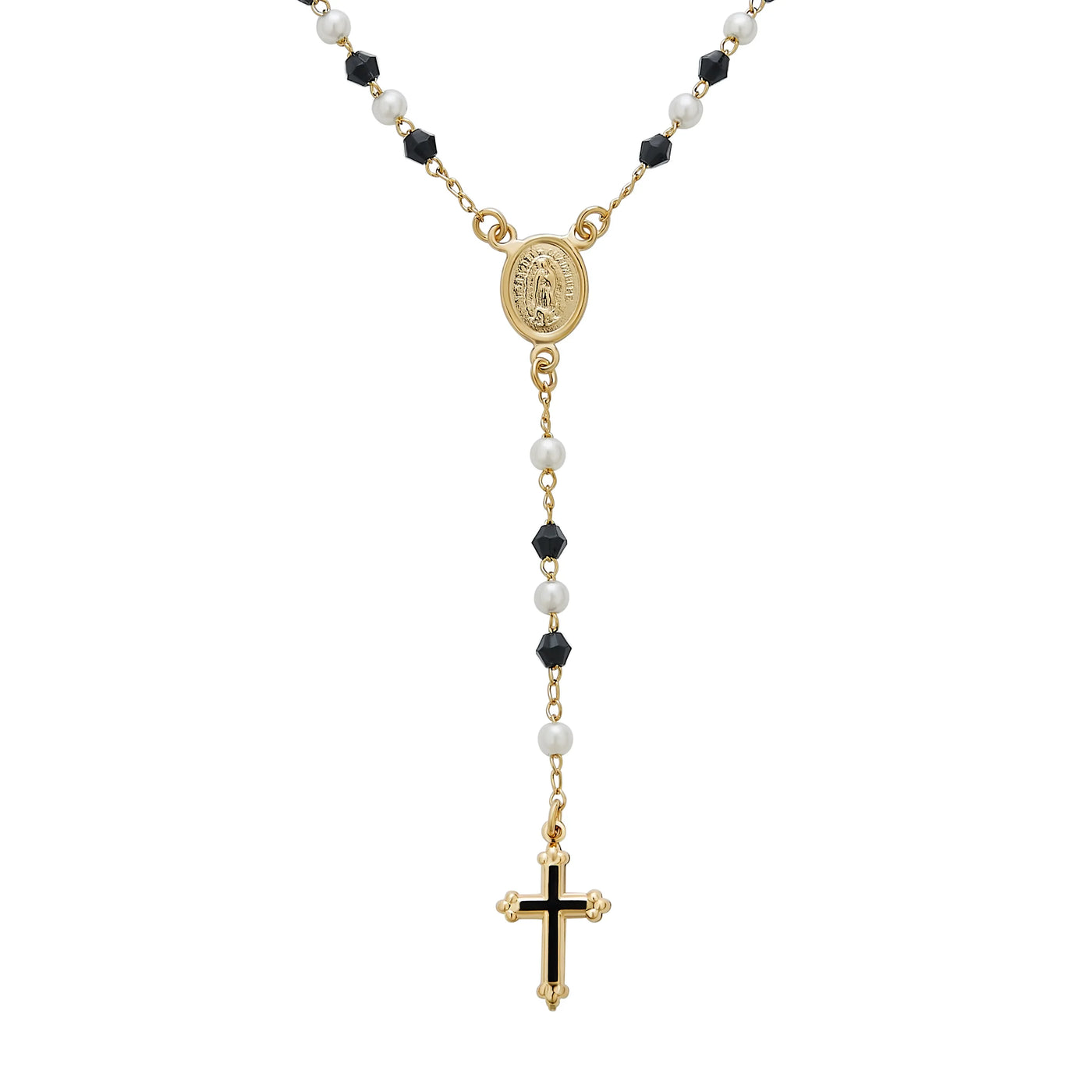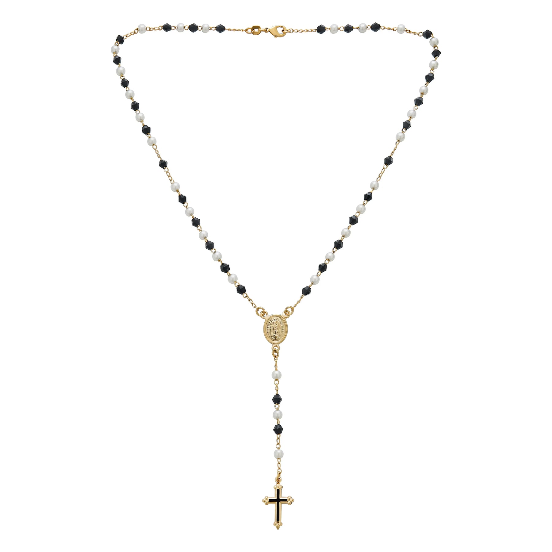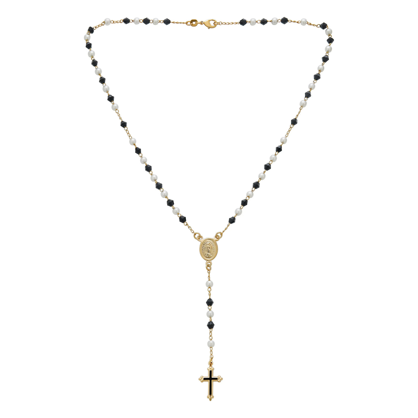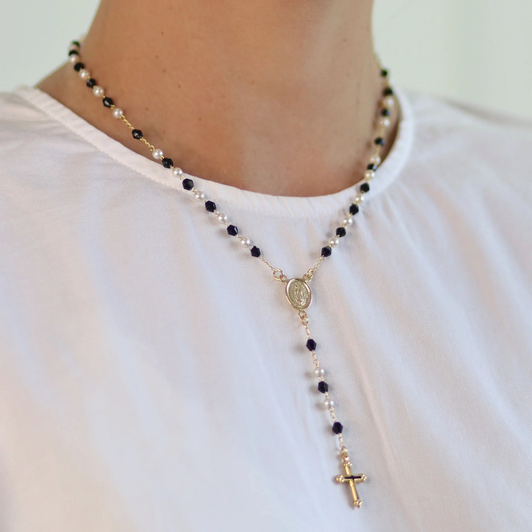- This Black & White pearl rosary bead necklace showcases a beautifully designed oval medal of the Virgin Mary, accompanied by a black Fleur De Lis cross . It serves as an ideal gift for occasions such as Communion, Conformation, Christmas, or Easter, allowing you to express and honor your faith and religious devotion. With its timeless appeal, this Christian jewelry piece is suitable for women of all ages, making it a cherished accessory for a lifetime.