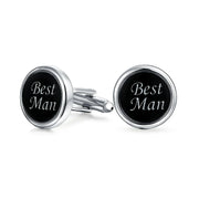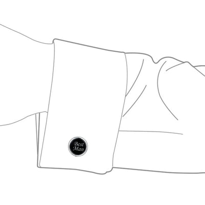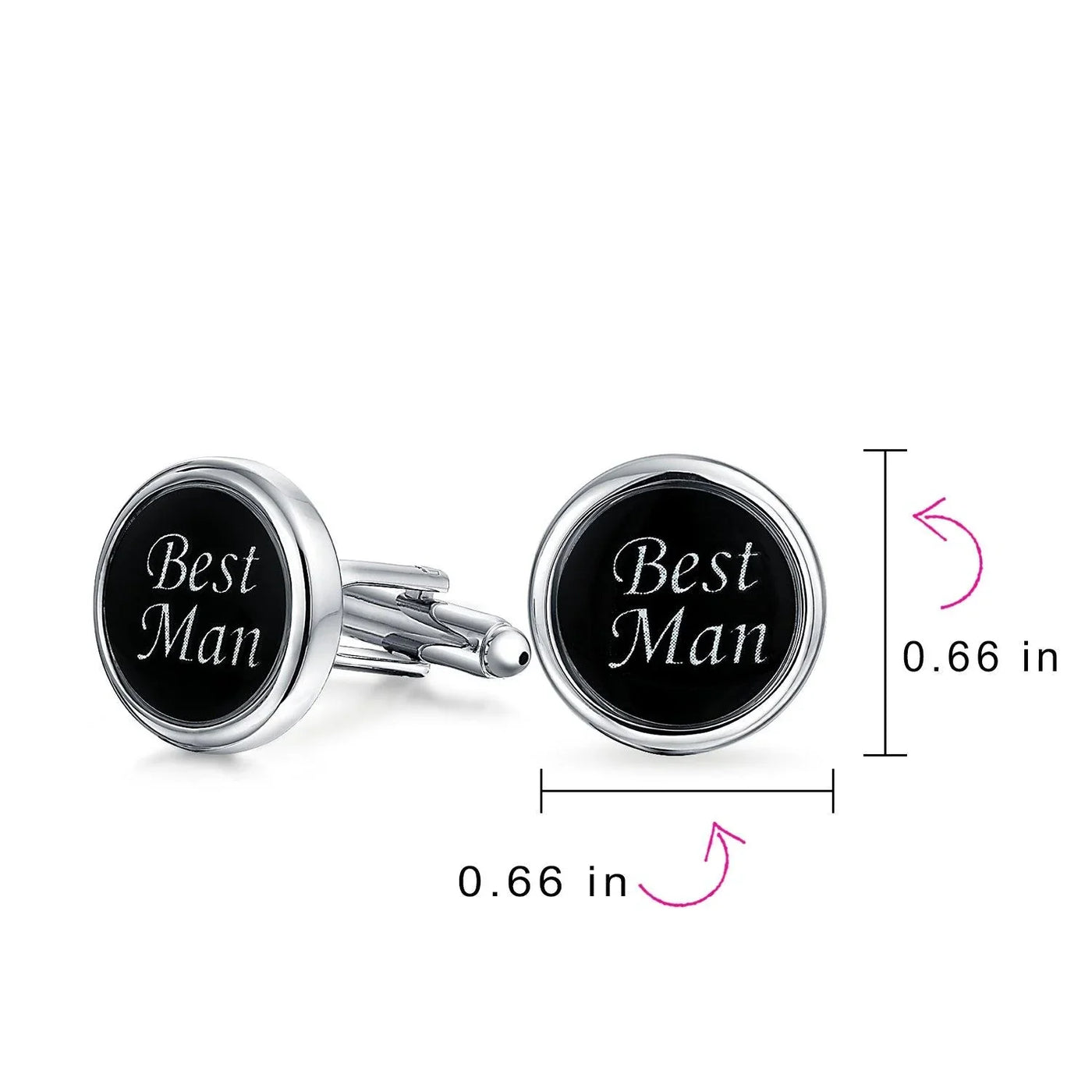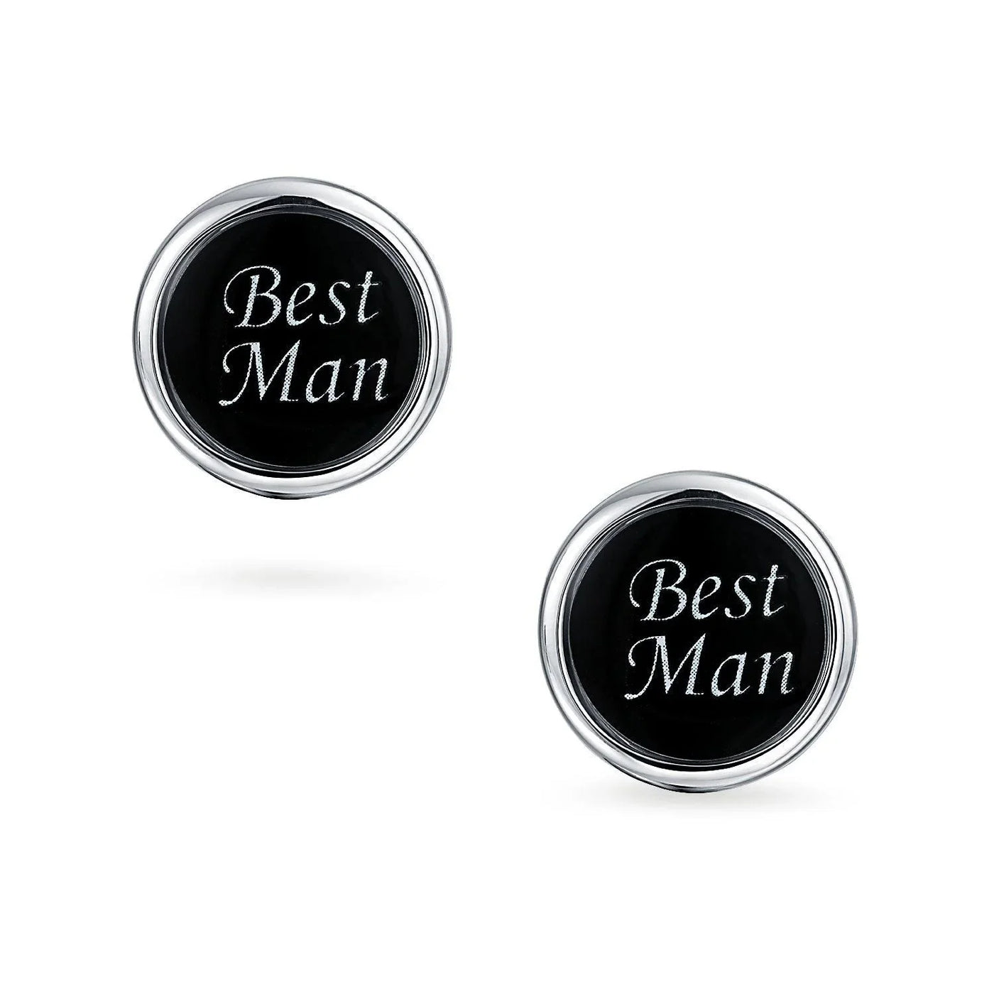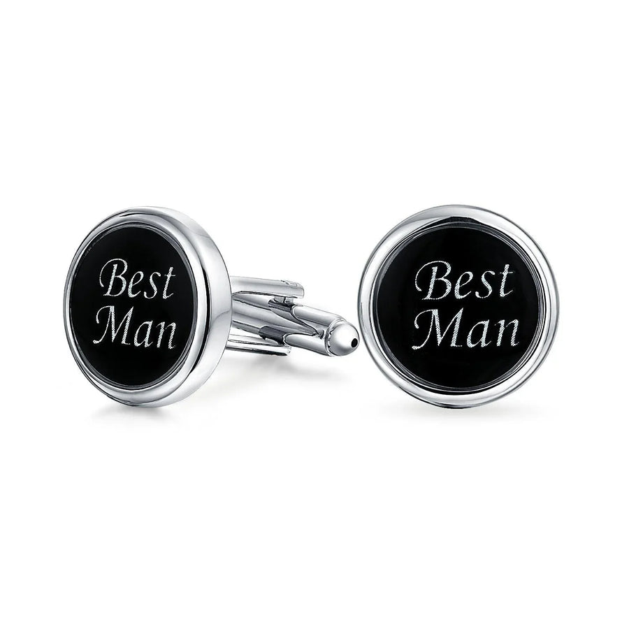 - As the Best Man, your first task is to get these stunning best man cufflinks. Rhodium-plated brass encases black enamel with white wedding font spelling "Best Man." Flaunt your pride with these exquisite men's cufflinks. Material: Brass, Rhodium Plating, Enamel. Measure: 0.66 inch L X 0.66 inch W. Weight: 16.4 grams.