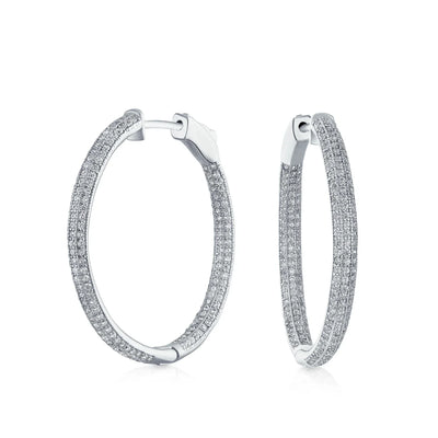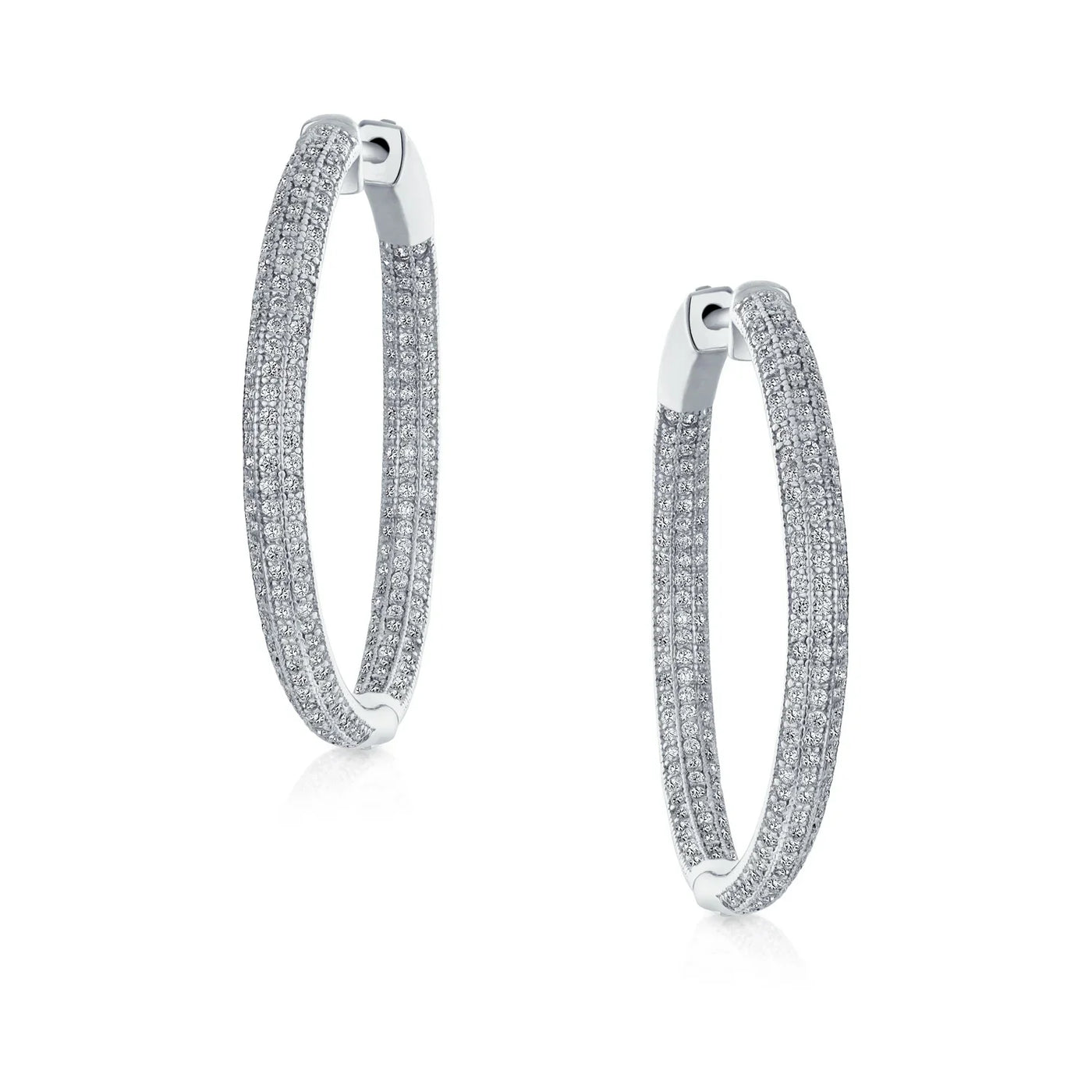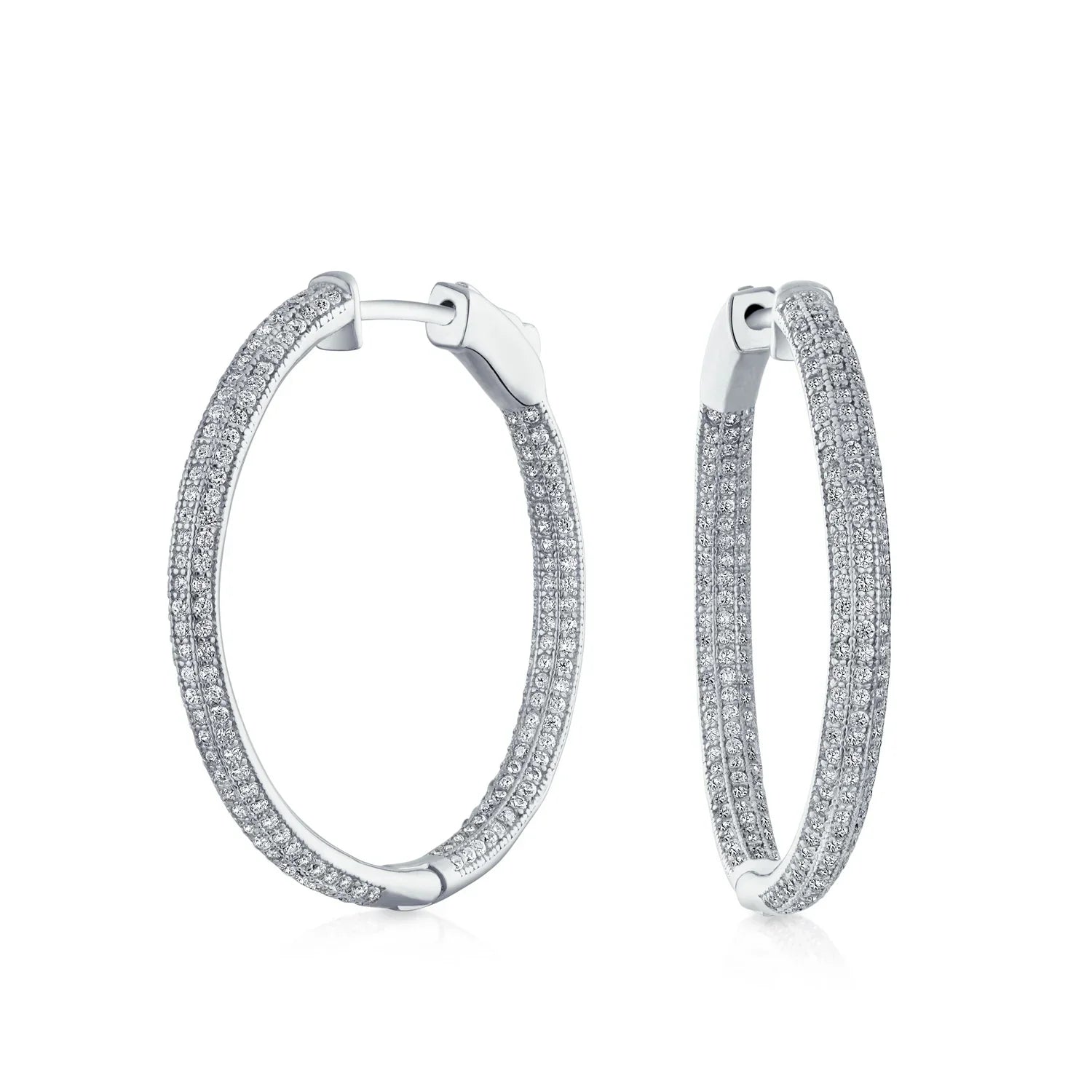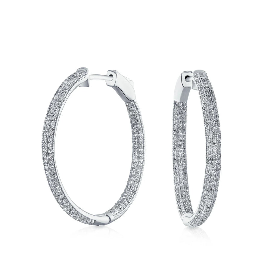 - These genuine rhodium-plated .925 sterling silver hoops offer a sophisticated sparkle. Intricate micro pave setting adds style and glamour. At 35mm (1-3/8”), they accent both casual and formal wear beautifully.