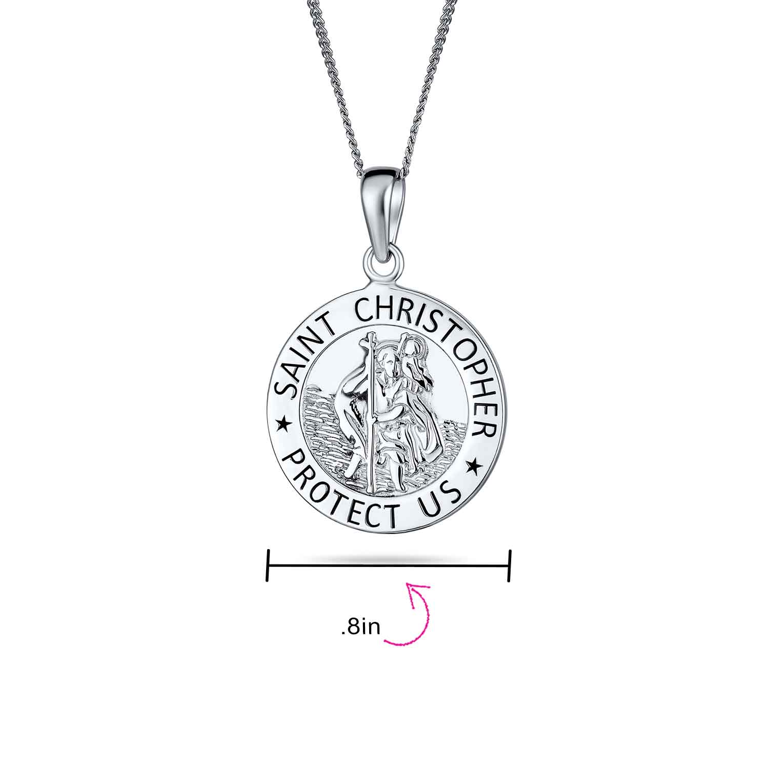 - This protective amulet is ideal for world travelers. Saint Christopher, patron saint of travels, is depicted with Jesus on his shoulder. The border reads "Saint Christopher Protect Us" with seven stars below. Catholic religious medal pendants honor patron saints and inspire devotion. Perfect gift for frequent travelers or those with mobile professions. Ideal for Christmas and Easter jewelry gifts. Made from .925 Sterling Silver, ensuring high quality. Comes with a 16-inch curb chain.