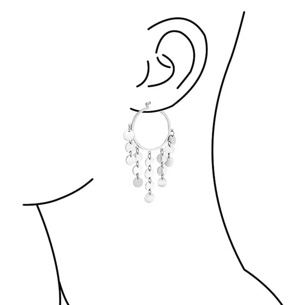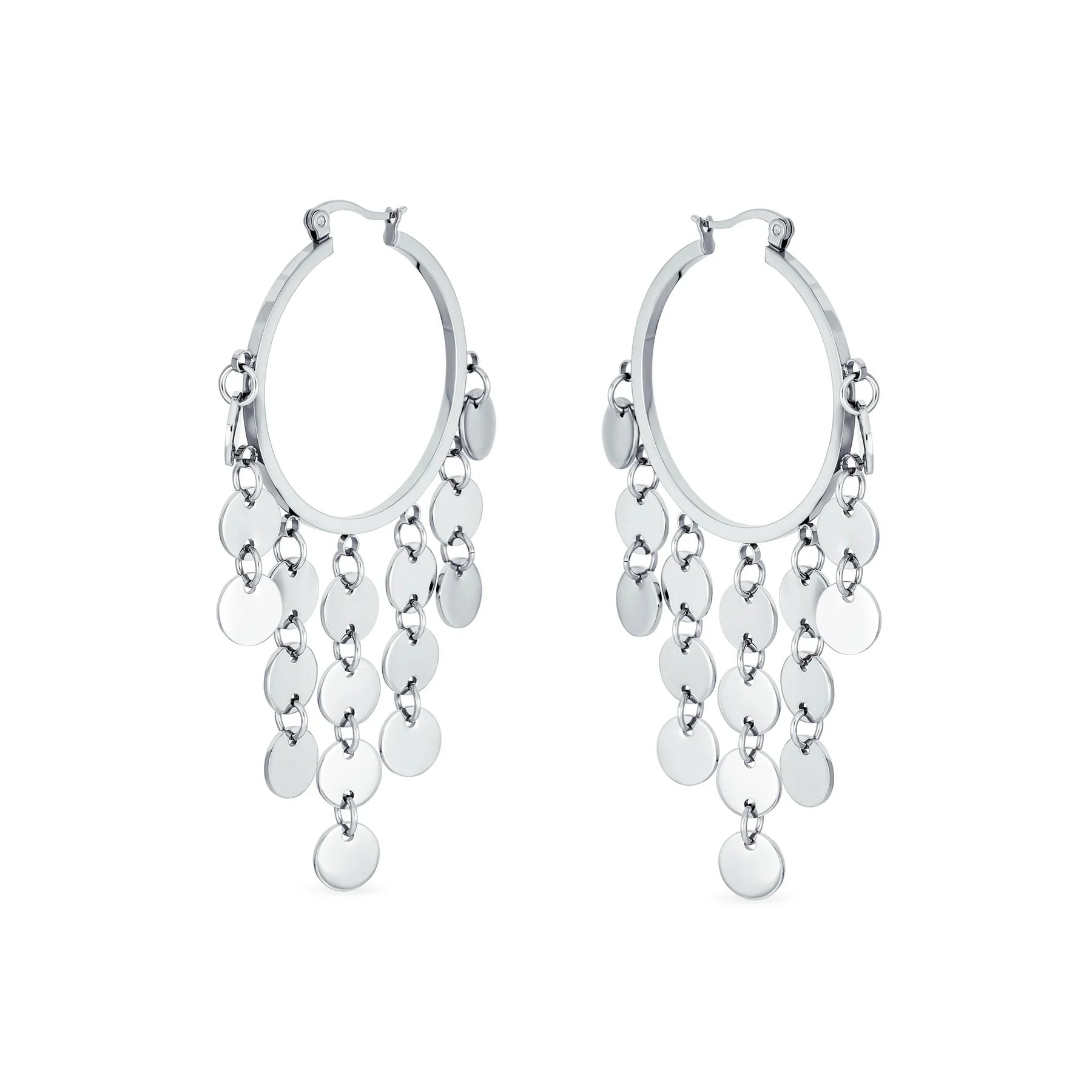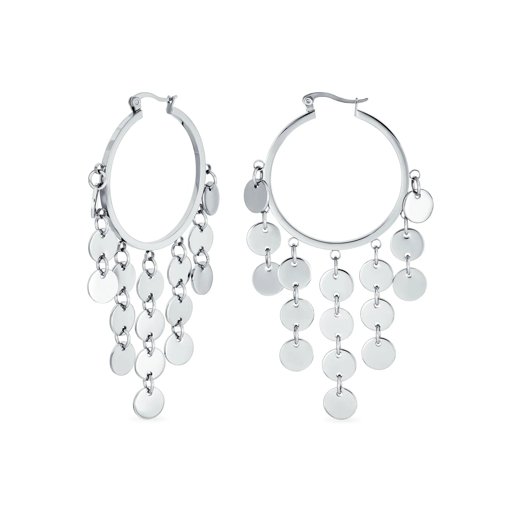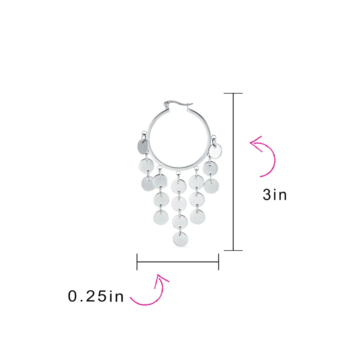 • Chic and sleek, shell love our 3in, stainless steel chandelier hoops to enhance any ensemble. With a boho feel and dangling discs, these earrings are a great gift.