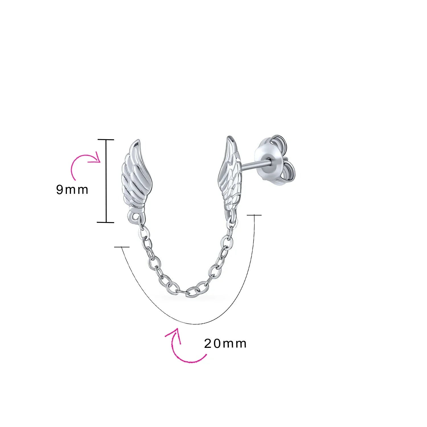 - ELEGANT DESIGN - Enhance your style with this exquisite sterling silver double ear stud, showcasing angel wings linked by a delicate chain. The celestial feather motif brings a touch of spiritual sophistication to any ensemble.