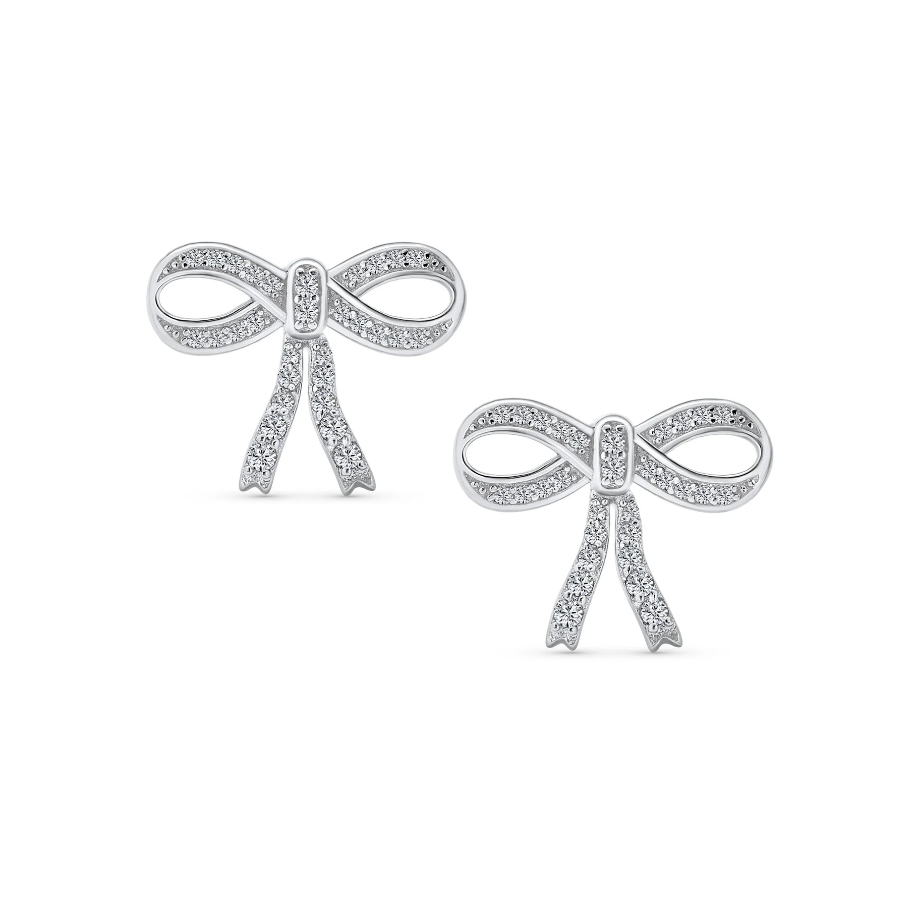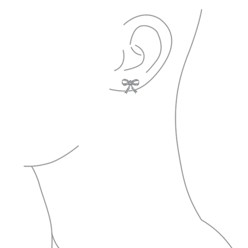 - These rhodium-plated bow earrings offer a stylish twist on a classic design, featuring pave CZ accents for added sparkle, making them an ideal gift for anyone with pierced ears and a modern sense of style.