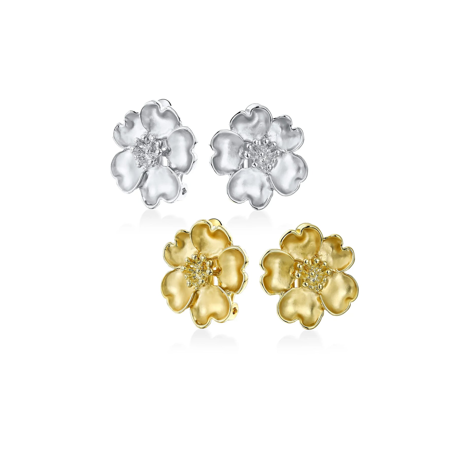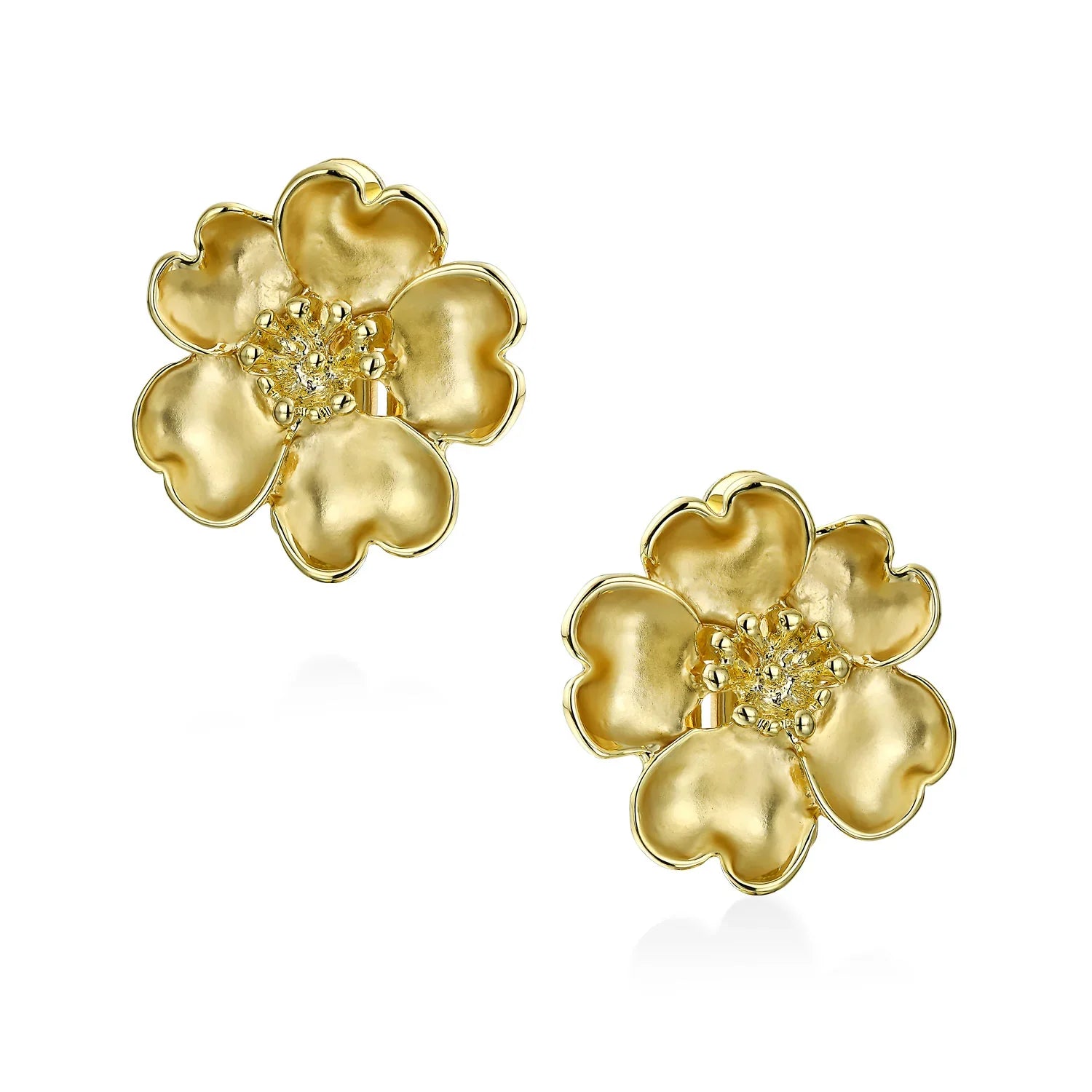 - Embrace spring with Gold Plated flower clip-on earrings. Chic and simple, perfect for casual or formal wear. Heart-shaped petals complement floral jewelry. For that sophisticated touch, to elevate both daytime and evening looks, choose these sweetly delicate, brass clip on earrings for non - pierced ears.