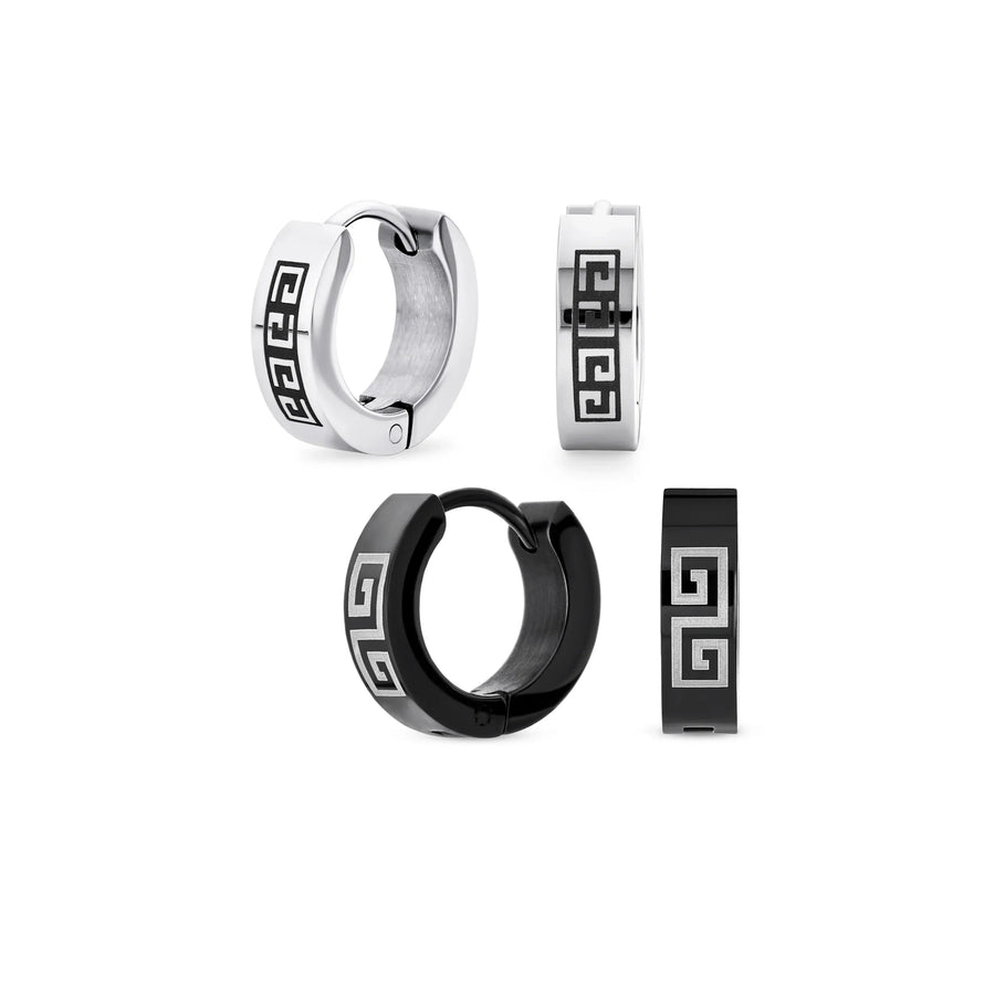 - Elevate your style effortlessly with our newest Greek Key Design earrings. Add dazzle and sophistication to your daily look. Crafted in stainless steel with black IP plating, they offer a stunning two-toned appearance. Lightweight and comfortable, they open easily on a hinge and snap securely in place. Perfect for Father's Day gifts, helping dads stay trendy and stylish. Ideal for graduates, adding a touch of power as they embark on new journeys.
