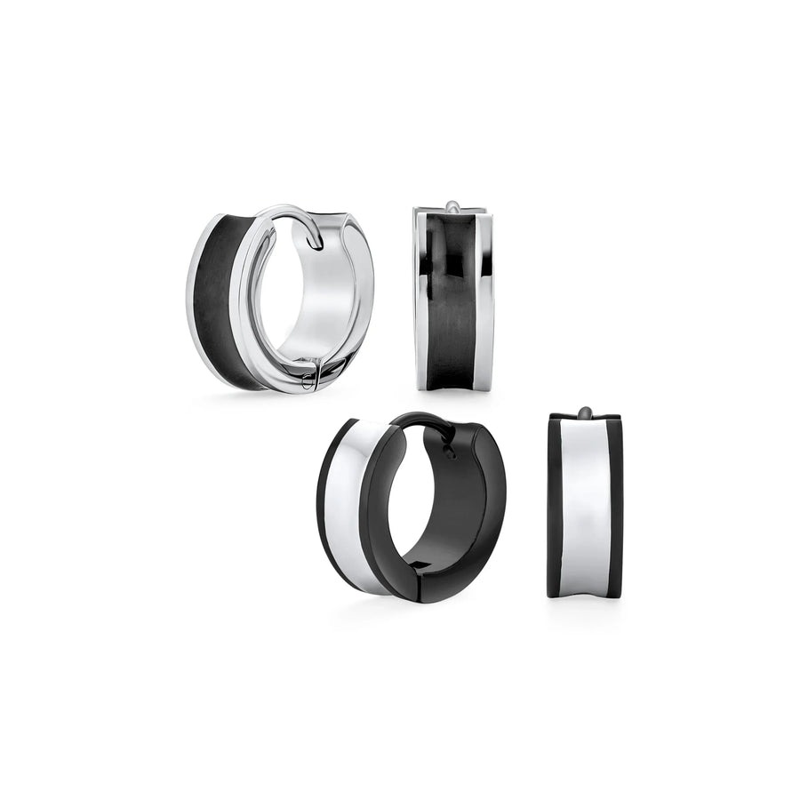 Set of 2 Two Tone Striped Black Enamel Huggie Hoop Earrings Stainless Steel - Bling Jewelry