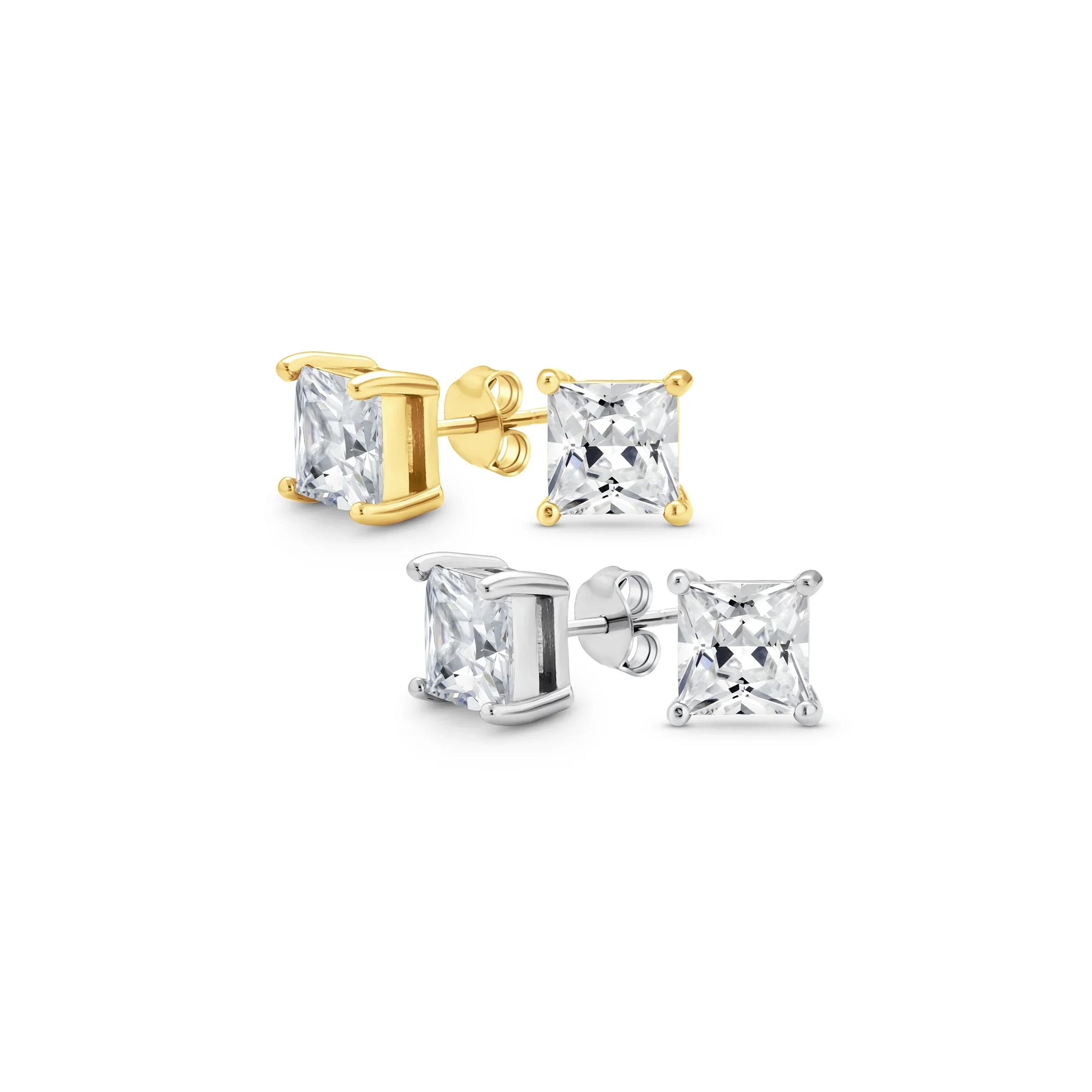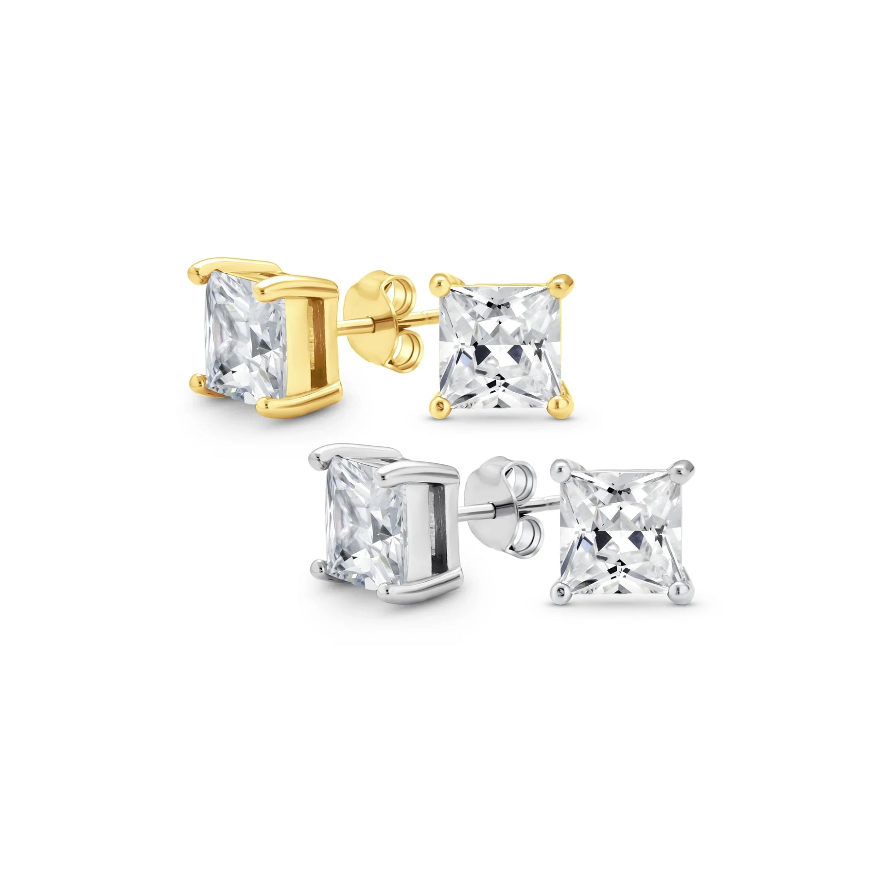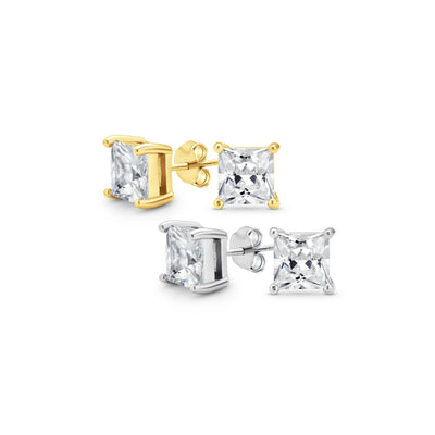 - Achieve a timeless and sophisticated look with our Gold Plated Unisex Square CZ Princess Cut Stud Earrings. These affordable cubic zirconia earrings exude natural beauty. Featuring .925 sterling silver, these gold-plated studs are both stylish and elegant. The 8mm square cut CZ stone adds a radiant and chic touch. Perfect for any outfit, these earrings capture attention effortlessly. Ideal for men and a perfect holiday gift.