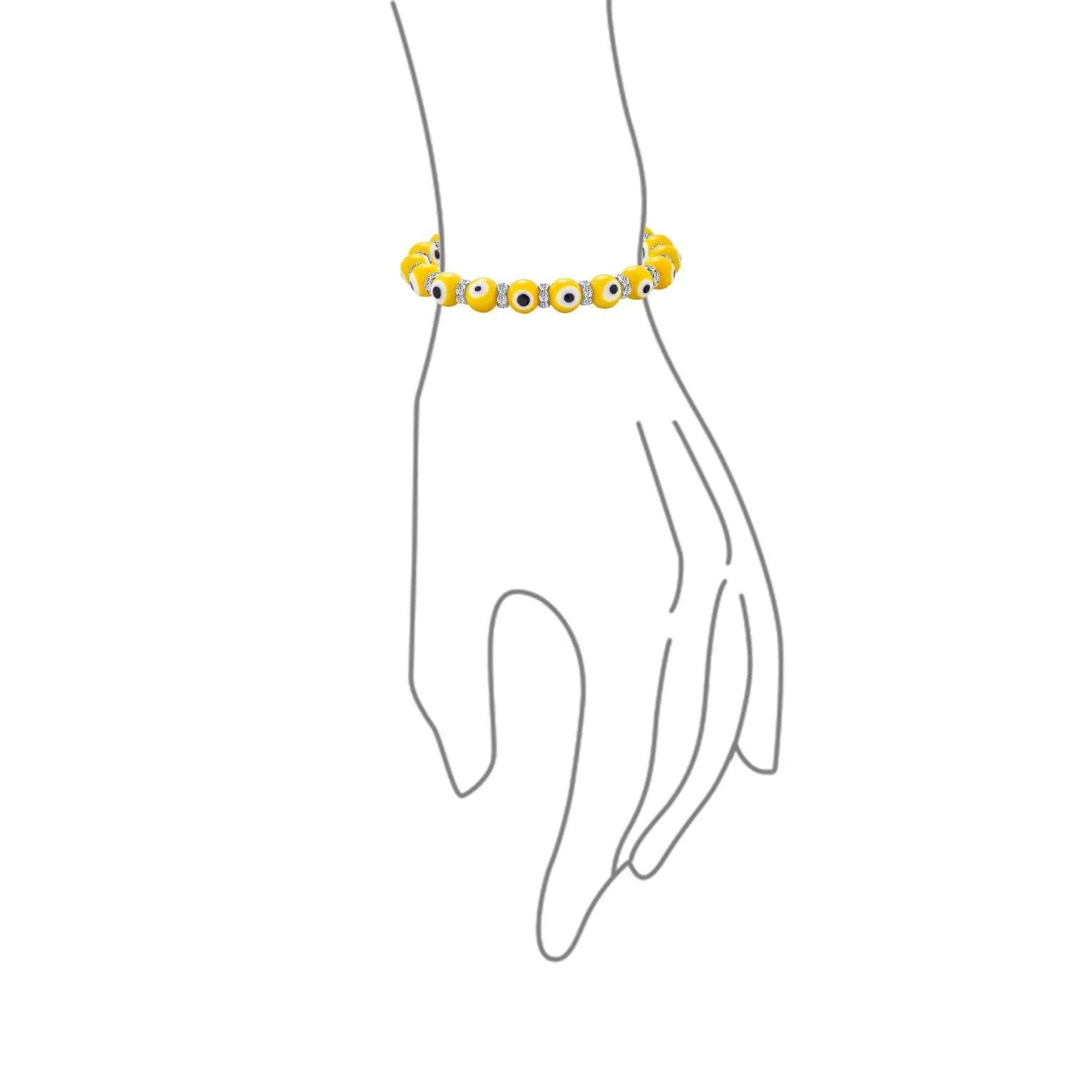 - Enhance your style with a vibrant spiritual touch, channeling positive energy through this captivating stretch beaded bracelet, featuring yellow evil eye beads interspersed with sparkling crystal Rondelle spacers.