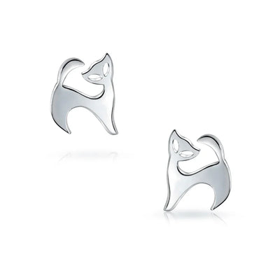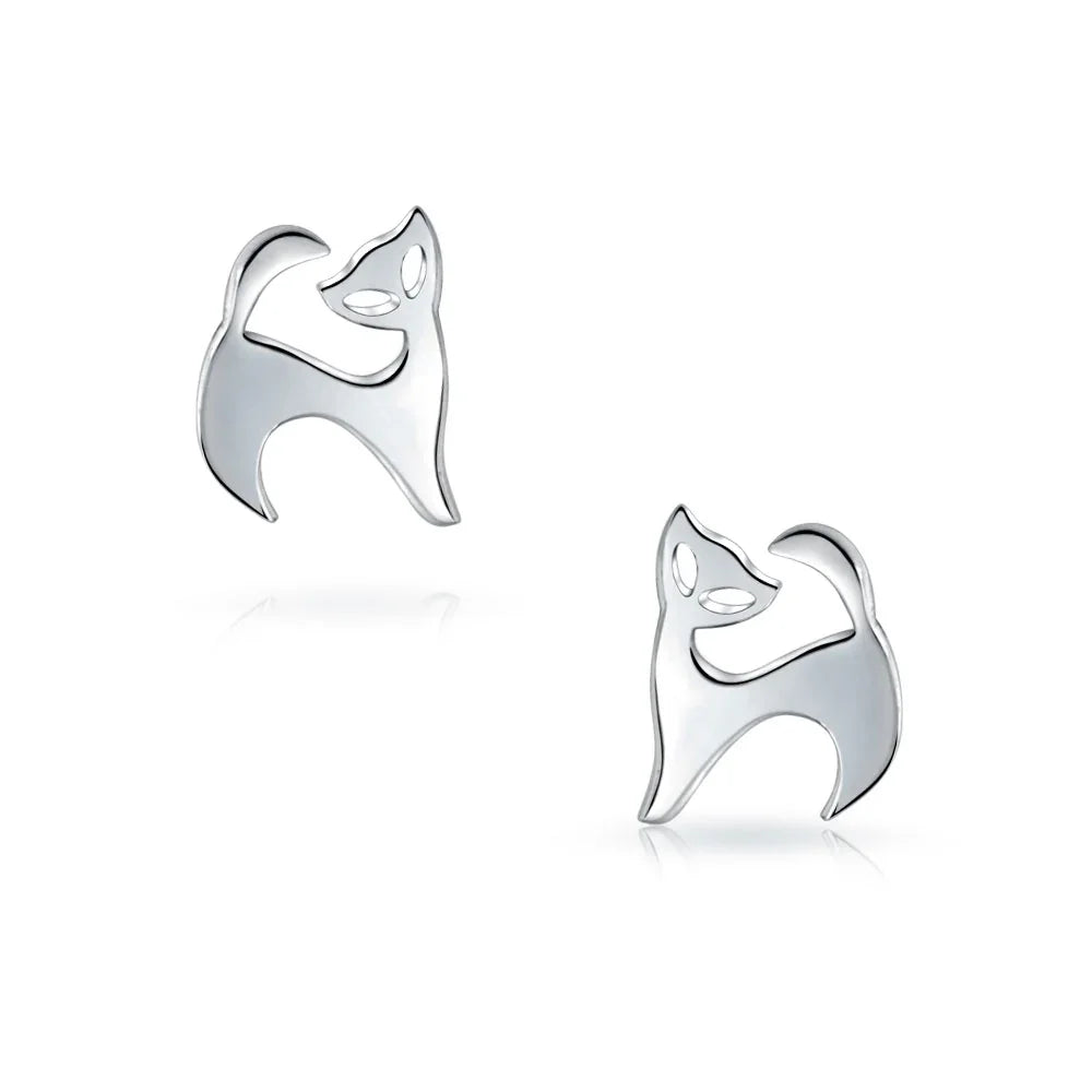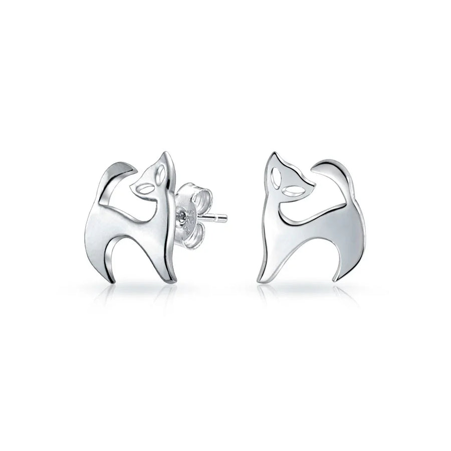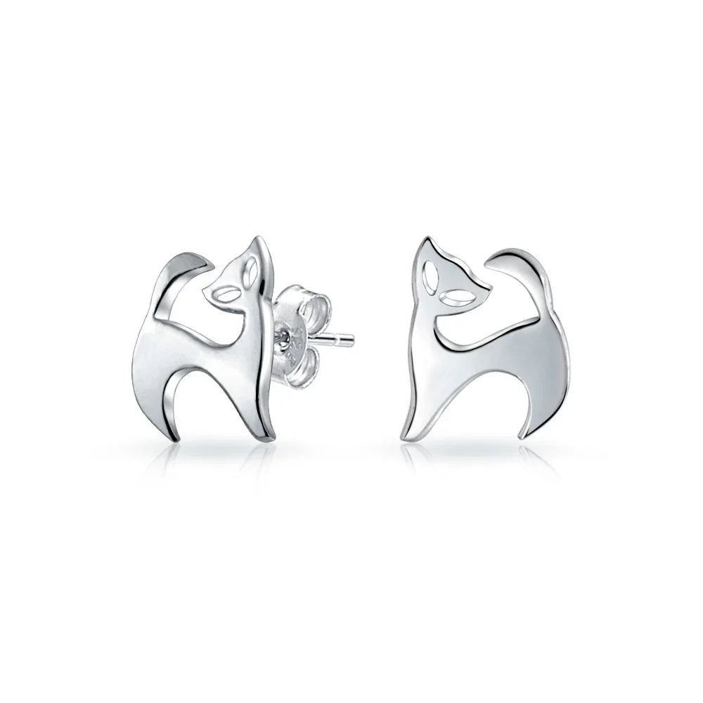 - Adorable sterling silver cat stud earrings for fashionistas and cat lovers. These shiny silver cat studs offer a fresh, modern vibe. Each earring features a cat with an arched back, curled tail, and cutout eyes. A must-have for any jewelry box, adding panache to your style. Secure post with friction back closure ensures all-day comfort. Lightweight at under one gram, perfect for all-day wear. Ideal gift for friends who love animal jewelry.