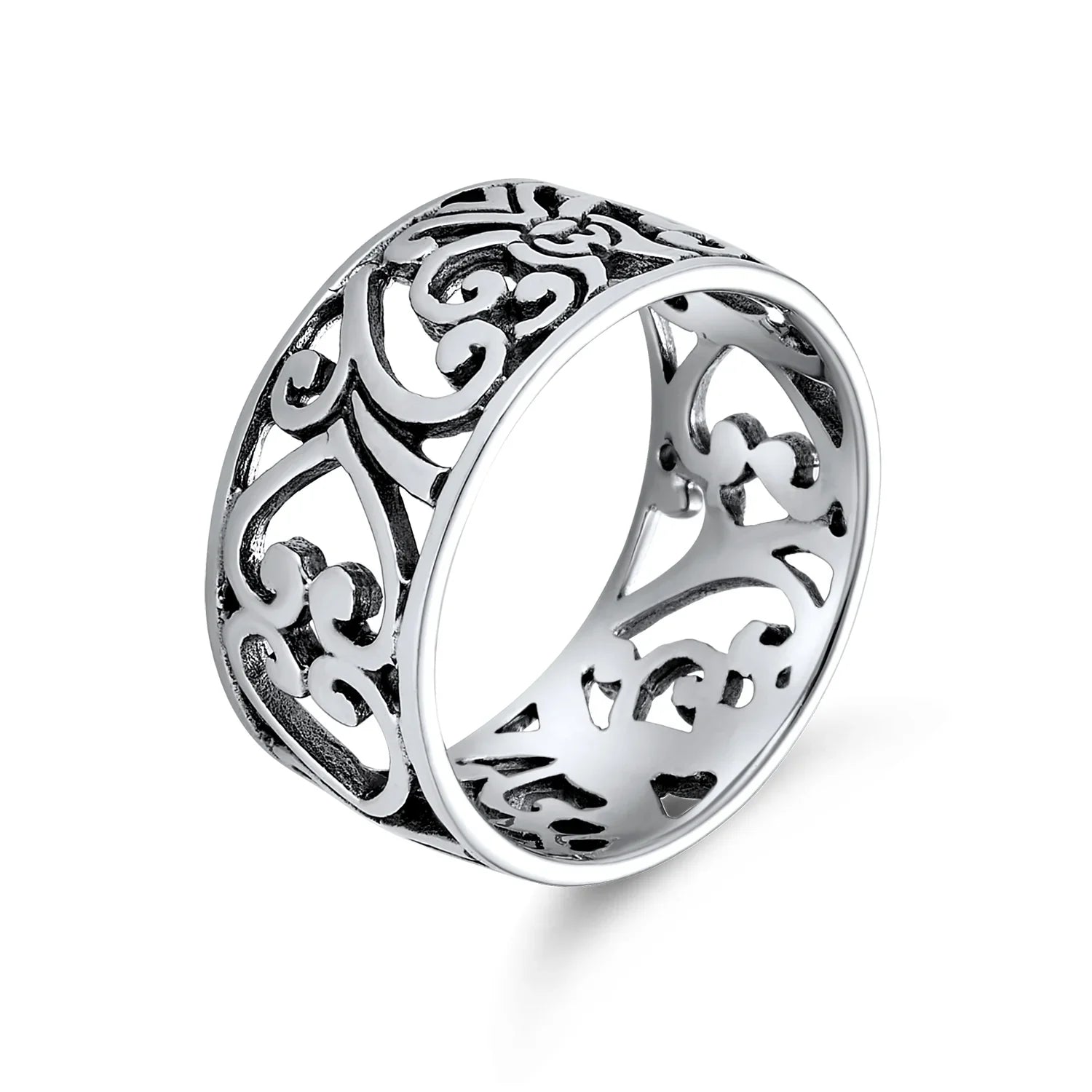 - This sterling silver open filigree ring is a stunning piece she'll adore. At 10mm wide and size 9, this eye-catching swirling band is a versatile must-have.