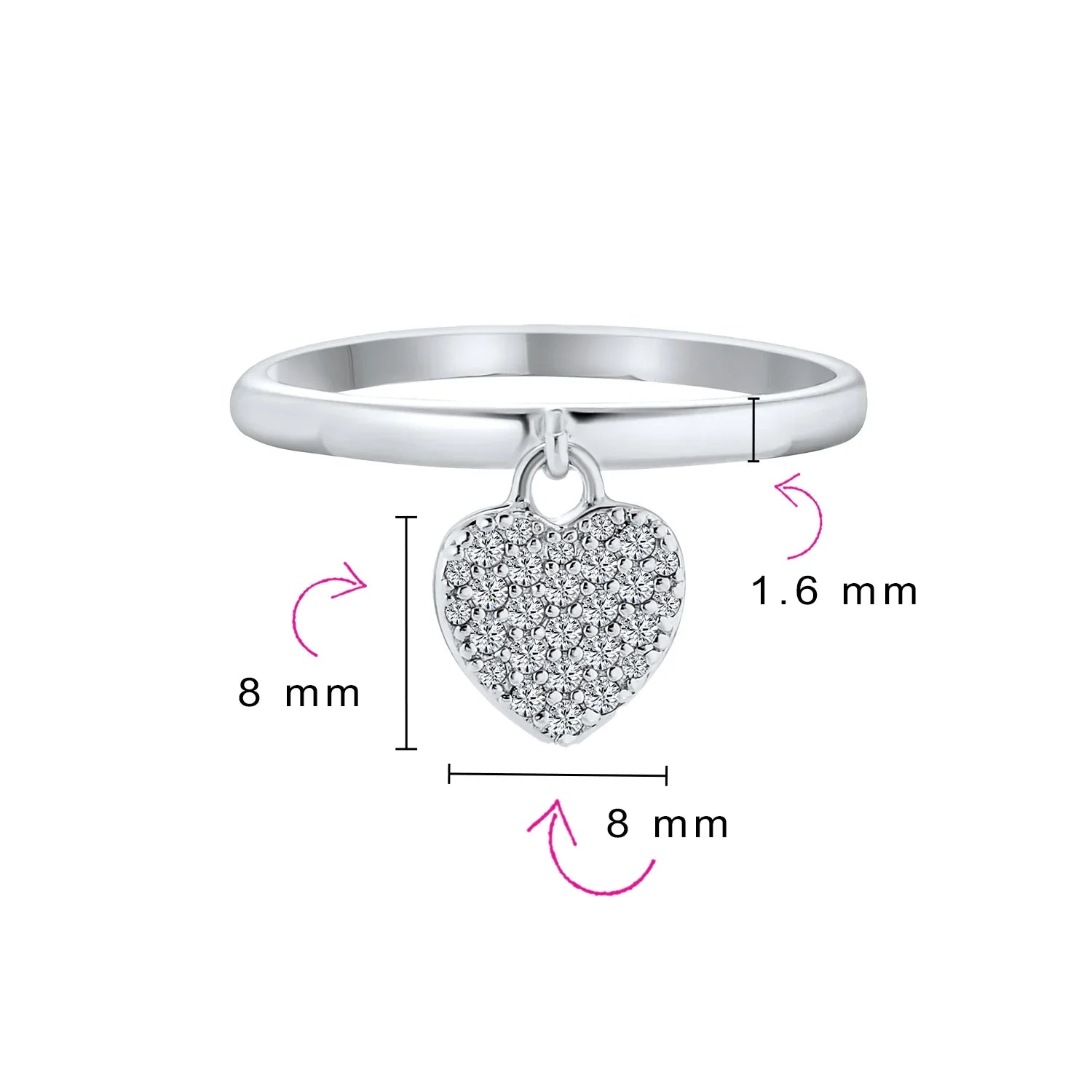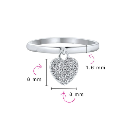 - This unique ring has a dangling cubic zirconia heart charm ring that is sure to win over any fashionista. With pave CZ sparkle, this sterling silver ring in a thin band is perfect romantic gift.