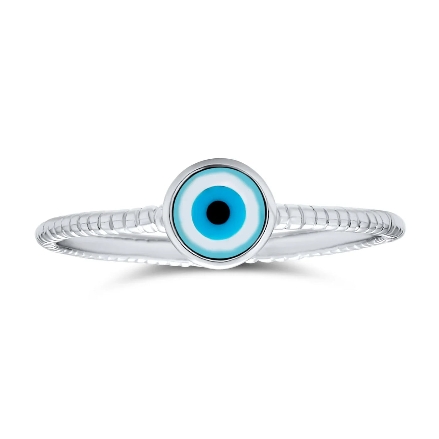 - Discover the perfect thin sterling silver stacking ring, a stylish trendsetter. The evil eye symbolizes good luck and protection from negative energy. Embrace inspirational jewelry and let good fortune follow you. Exotic evil eye stackable rings maintain your unique style. This sterling silver piece combines symbolism and fashion, featuring a mother of pearl evil eye. Wear as a midi, mid knuckle, or forefinger ring for a Boho chic look. Mix and match silver stacking rings to suit your wardrobe and mood. Happy shopping!