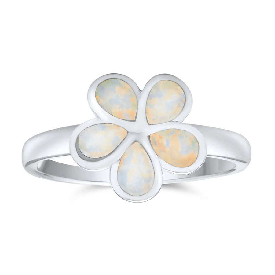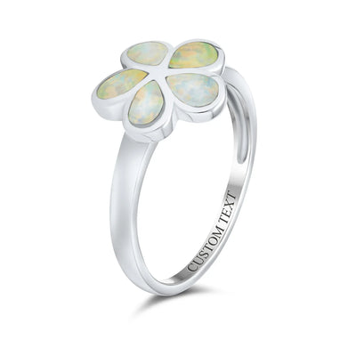 - April showers bring simulated white opal Plumeria flower rings, featuring an 11mm Hawaiian Plumeria design, making it the perfect chic island-style gift for October.