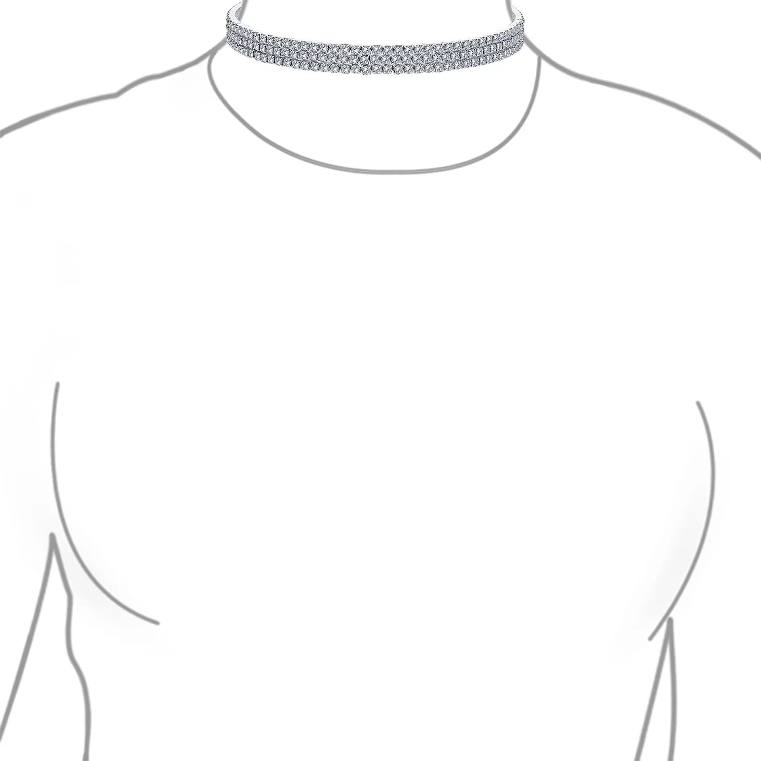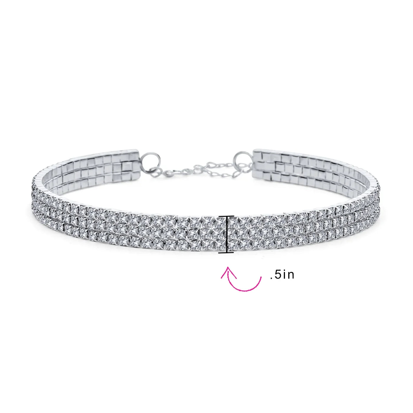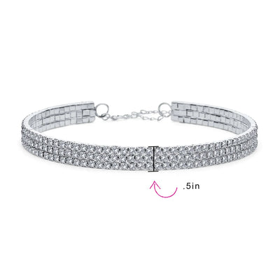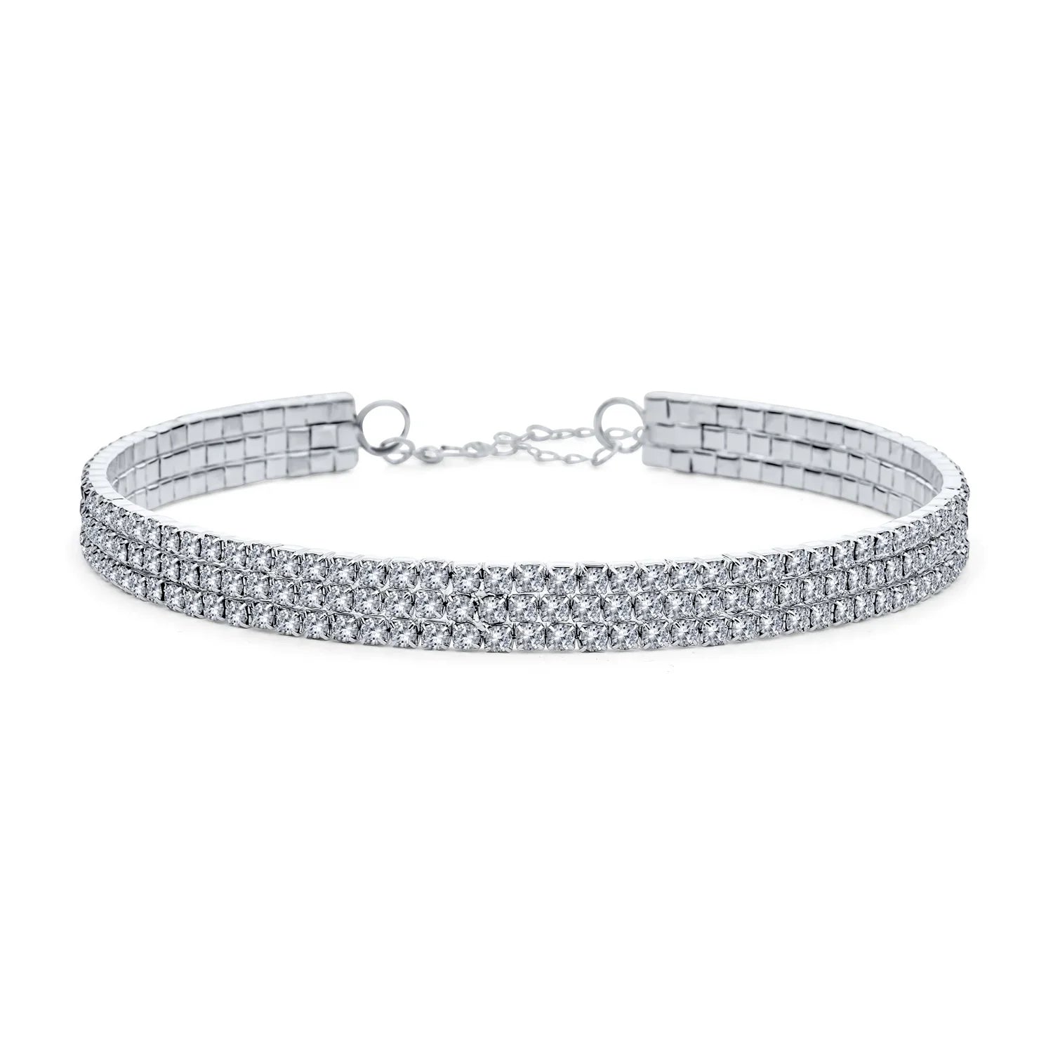 - Enhance your wardrobe with a dazzling three-row sparkle choker. This elegant necklace features an adjustable extender and a secure lobster claw clasp, ensuring a perfect fit for nearly anyone. With rhodium plating, this 0.5" wide bridal choker adds a touch of glamour to any outfit.