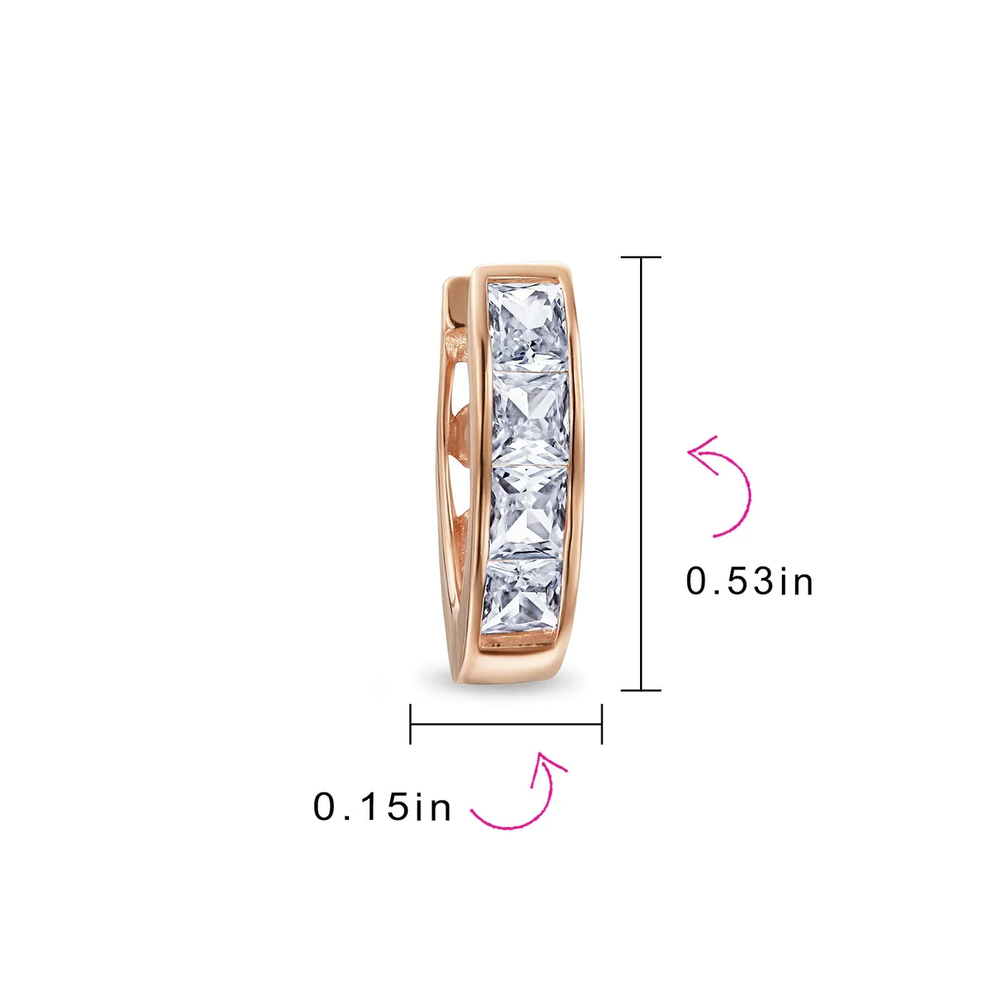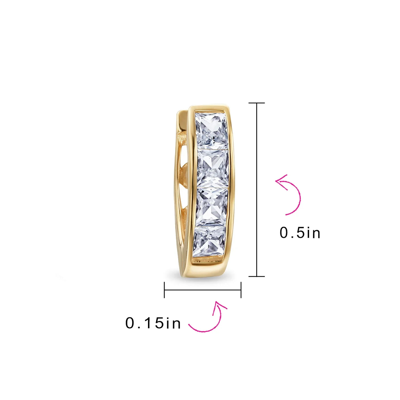 • Fashionistas know that huggie hoop earrings are hot. Our .925 sterling silver checkerboard cut cubic zirconia huggie hoop earrings are subtly sophisticated. Exquisite for a bridal party or sensational for a black tie event, these luscious cz stone huggie earrings will quietly steal the show every time. Featuring invisible cut s, our unisex earrings fit comfortably and snug on the earlobe. If you do not have a pair yet, our sterling silver hoops will make you feel like the center of attention.