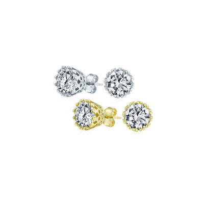 Set of 2 Crown Basket Clear CZ Stud Earrings Gold Plated Sterling Silver 6MM - Bling Jewelry