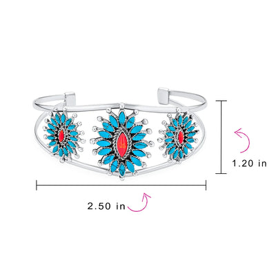 - Fall in love with flowers wearing our red Dyed Coral Stabilized Turquoise squash blossom cuff bracelet . Embrace the southwest style with this native American inspired accessory, a true piece of wearable art. Crafted from 925 sterling silver, it features stunning Stabilized Turquoise and Dyed Coral stones in a three-flower design. This sterling silver flower cuff bracelet fits wrists up to 8 inches. Add this native American jewelry to your collection for a perfect touch. Ideal as a December birthstone gift, this fashion find is a winter must-have.