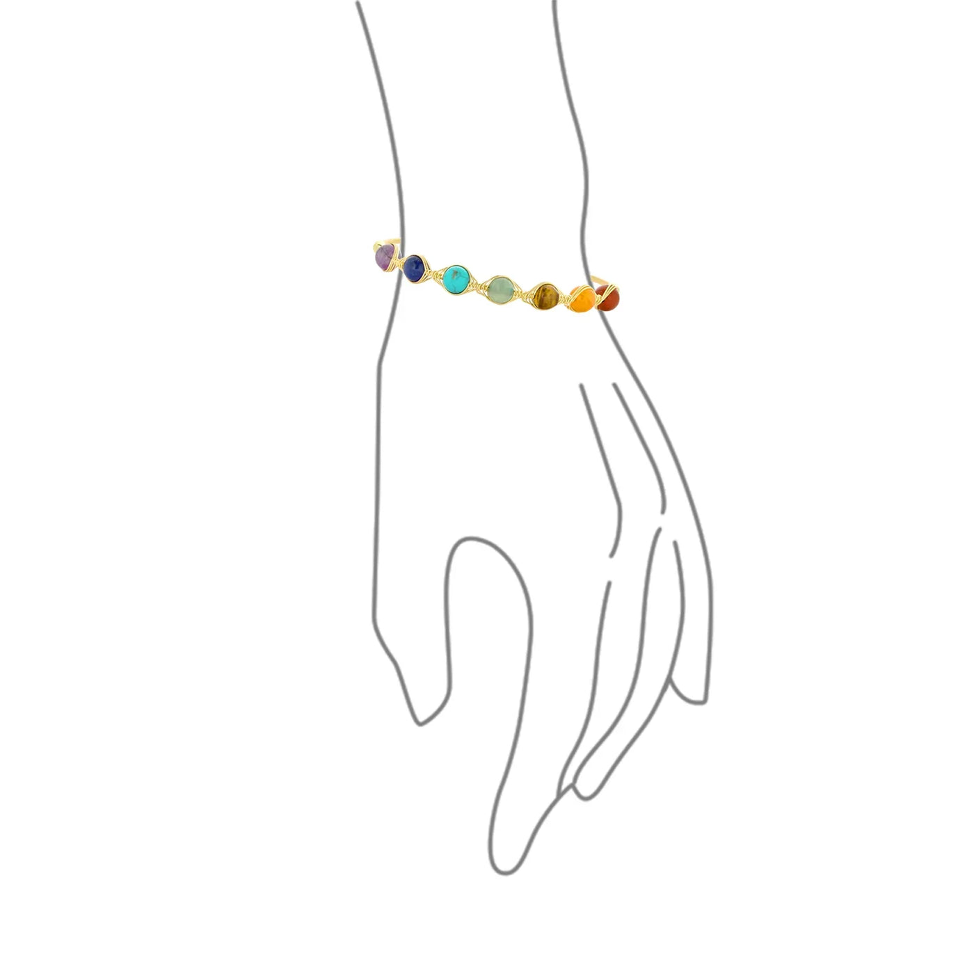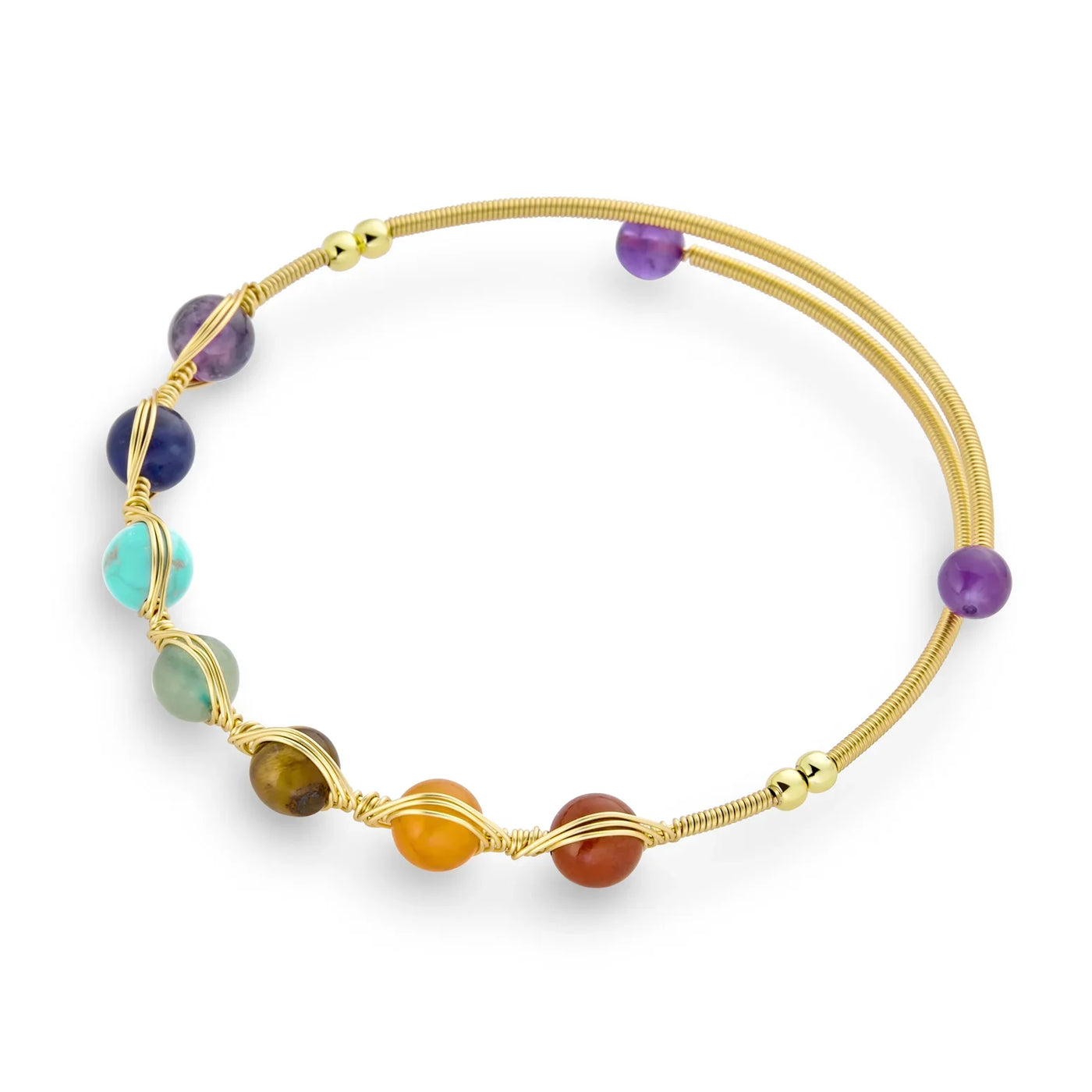 - Yoga philosophy holds that the chakras exist in the body. When you wear it, it promotes beauty, health, good luck, and healing. Balance all chakras, regulate bodily function, energizes every level of life .It is a great gift idea. This beaded wrap Chakra bangle bracelet features a rainbow of multicolored, gemstones including lapis, turquoise and amethyst.