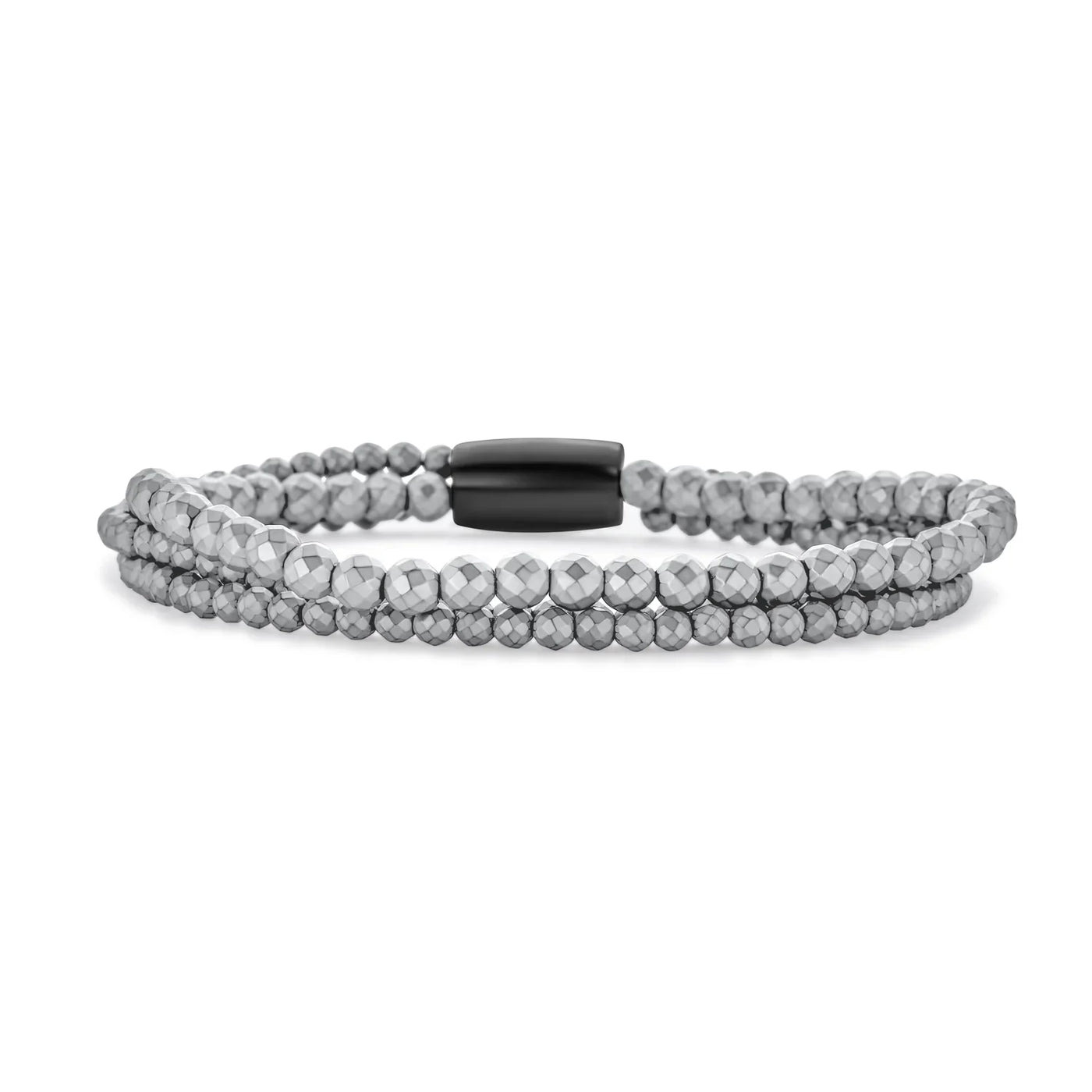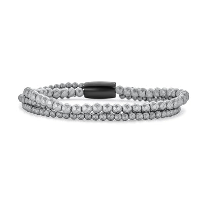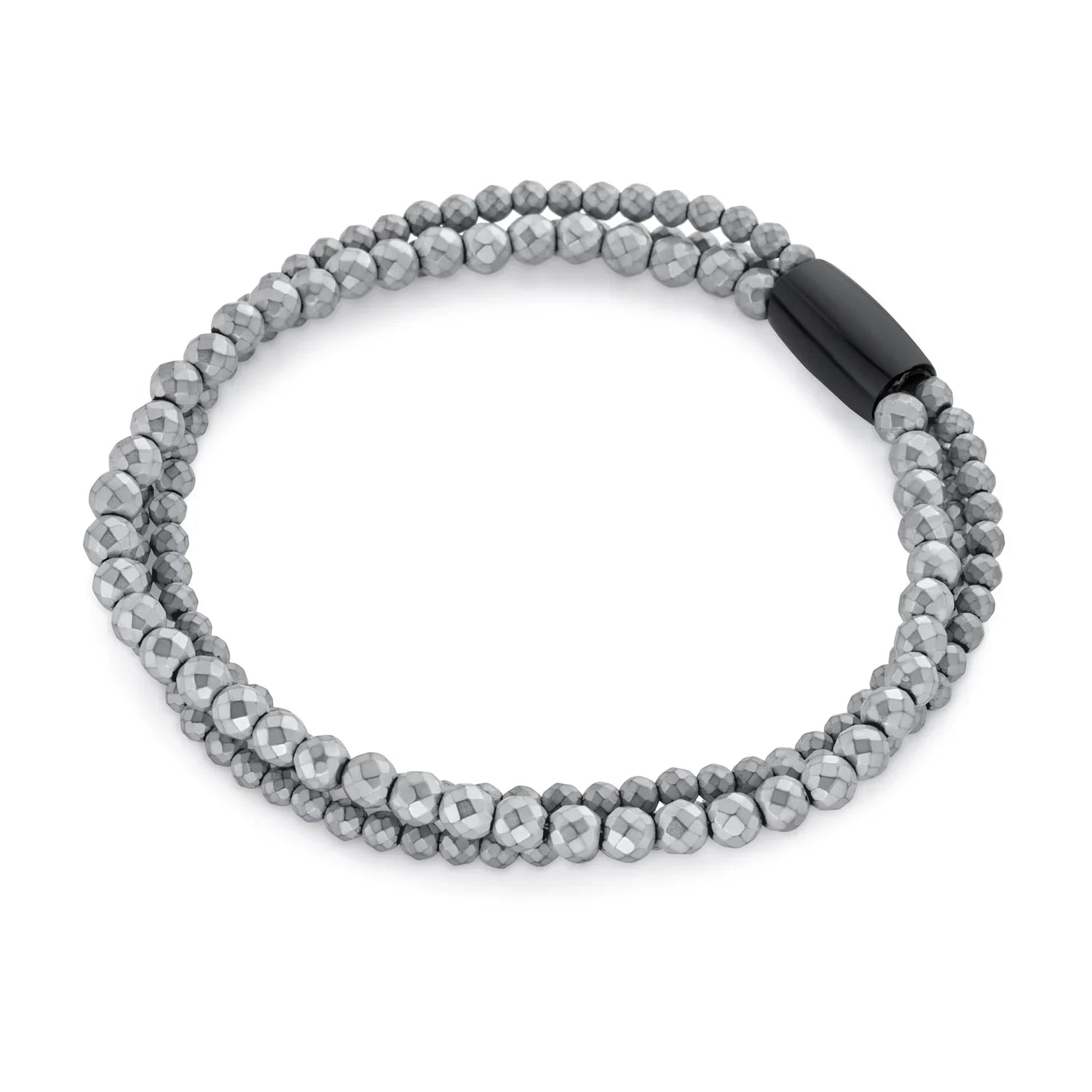 - This captivating bracelet showcases a bold design with industrial and geometric allure, featuring lustrous hematite, faceted beads, and an elegant oval clasp.
