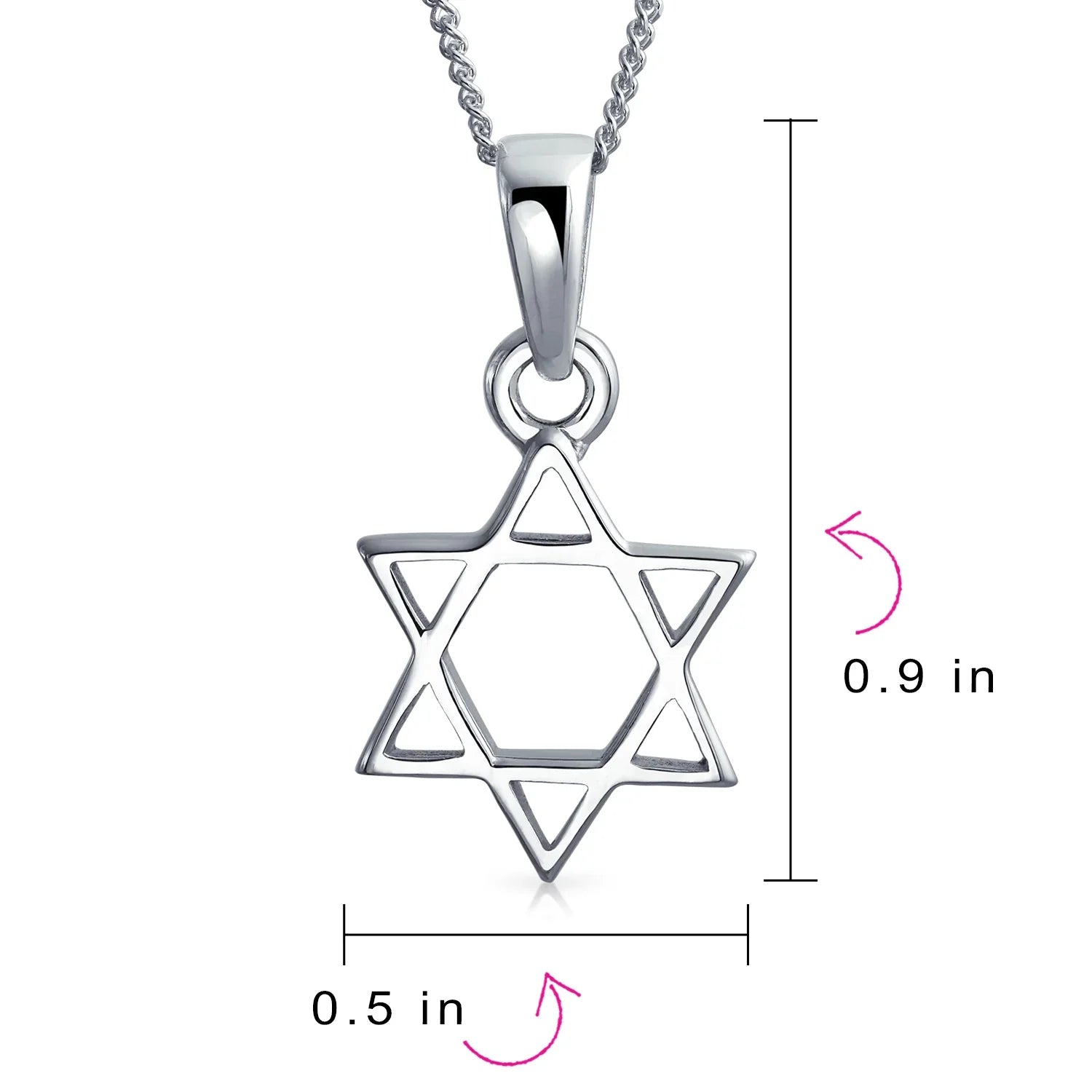 - Celebrate faith in style with this exquisite Star of David pendant necklace. Crafted from high-quality .925 Sterling Silver, this necklace showcases a stunning .5 by .5 inch Magen David motif. It comes with an 18 inch Cuban curb chain and a 2 inch extender, ensuring a perfect fit for anyone. The delicate size and small spring ring clasp add a touch of elegance to this beautiful piece. Whether it's for Passover, Hanukkah, or a special occasion like a Bar Mitzvah or Bat Mitzvah, this necklace makes a thoughtful and meaningful gift. Rewritten with additional keywords: Celebrate faith in style with this exquisite Star of David pendant necklace. Crafted from high-quality .925 Sterling Silver, this necklace showcases a stunning .5 by .5 inch Magen David motif. It comes with an 18 inch Cuban curb chain and a 2 inch extender, ensuring a perfect fit for anyone. The delicate size and small spring ring clasp add a touch of elegance to this beautiful piece. Whether it's for Passover, Hanukkah, or a special occasion like a Bar Mitzvah or Bat Mitzvah, this necklace makes a thoughtful and meaningful gift.
