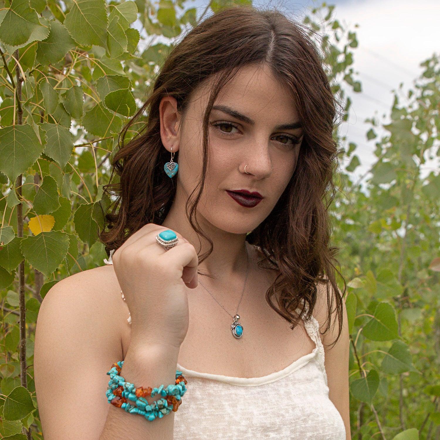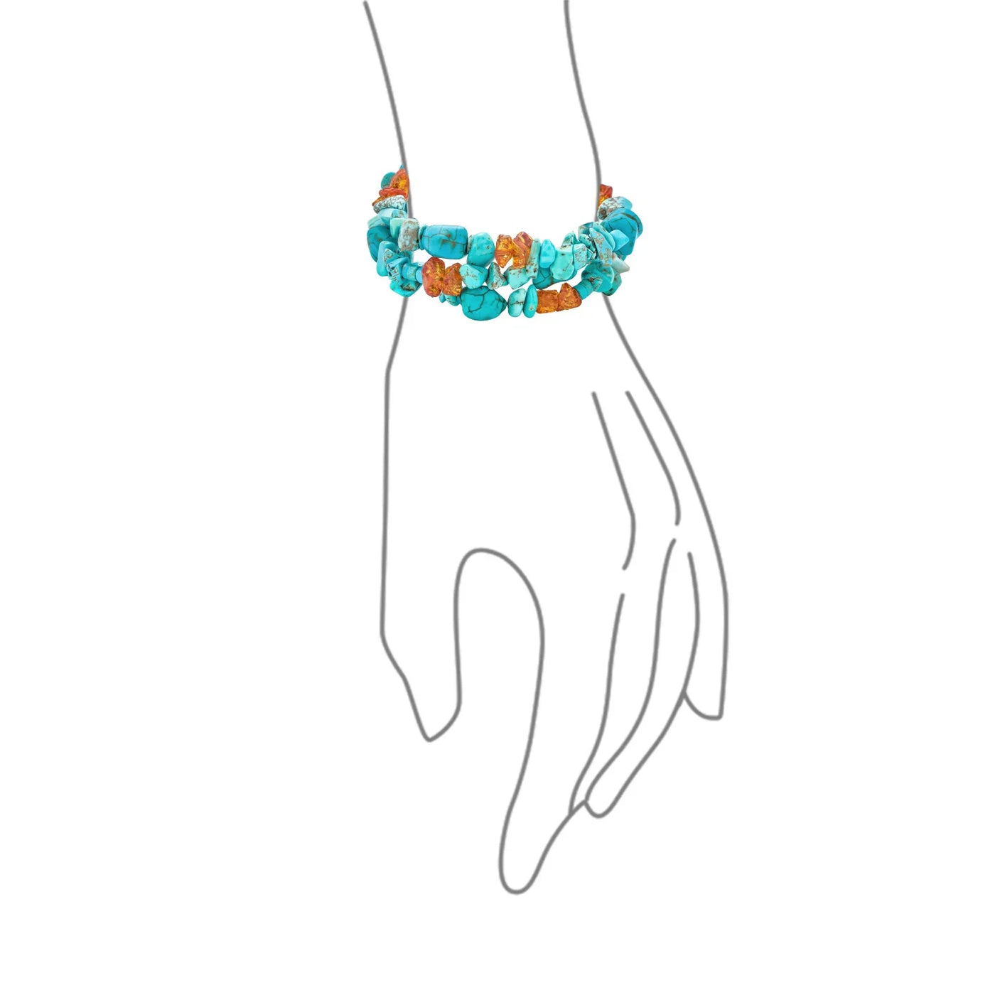 - An exquisite wide multi strand gemstone chip bracelet to add a luscious pop of color with Western chic glam to every look. This stunning bracelet features a vivid two tone, three strand design, with Stabilized Turquoise nuggets and amber, with a sterling silver bar clasp.