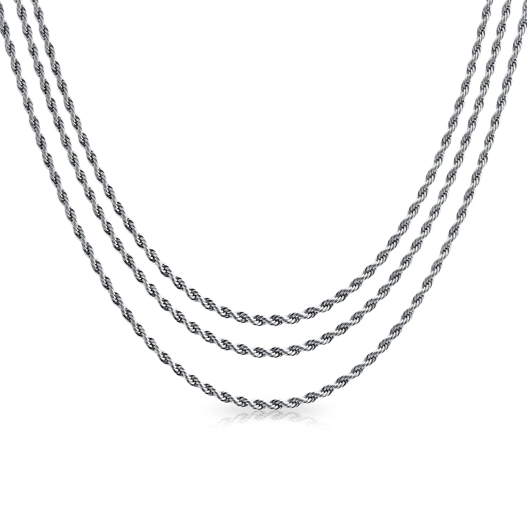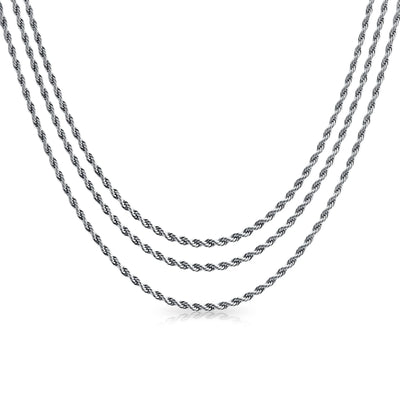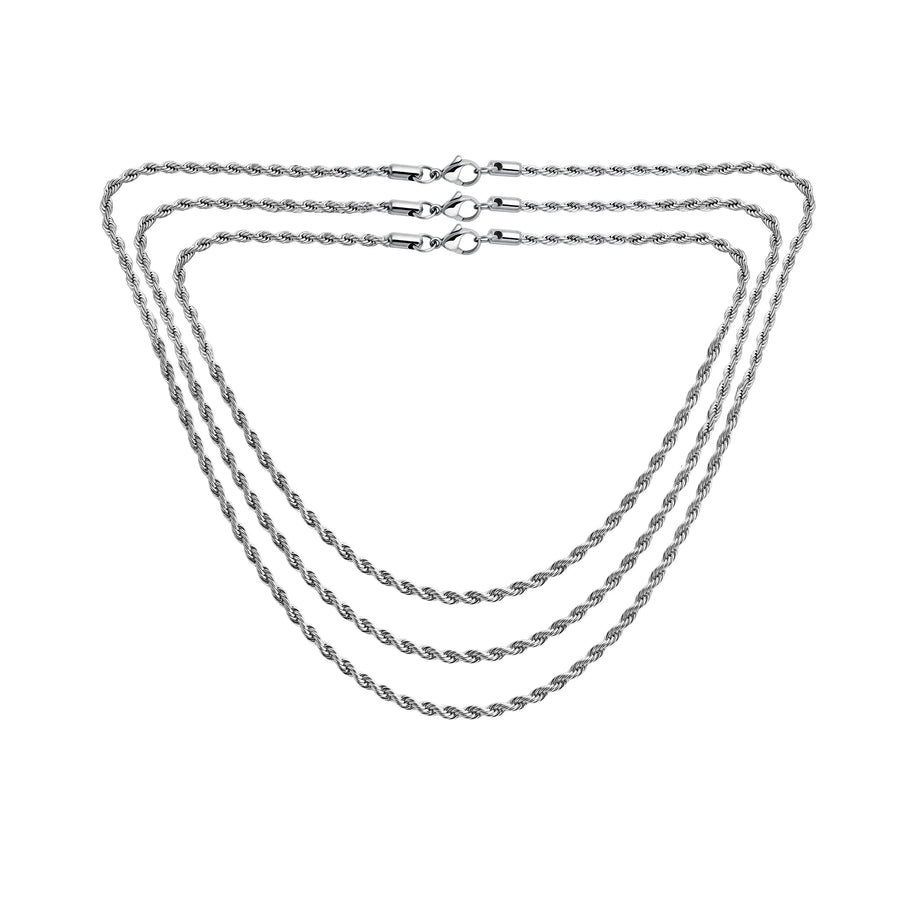 - Enhance your jewelry collection with our stylish, versatile rope chain. Made from premium Stainless Steel, it boasts a sleek rope design. With a 2.5mm width and 12.5g weight, it offers comfort and a casual vibe. Perfect for both men and women. This chain complements styles from casual to formal effortlessly. Ideal for jeans, tees, or dress shirts. Treat yourself or gift it for birthdays or Father's Day. Don't miss out—order your exquisite rope chain today!