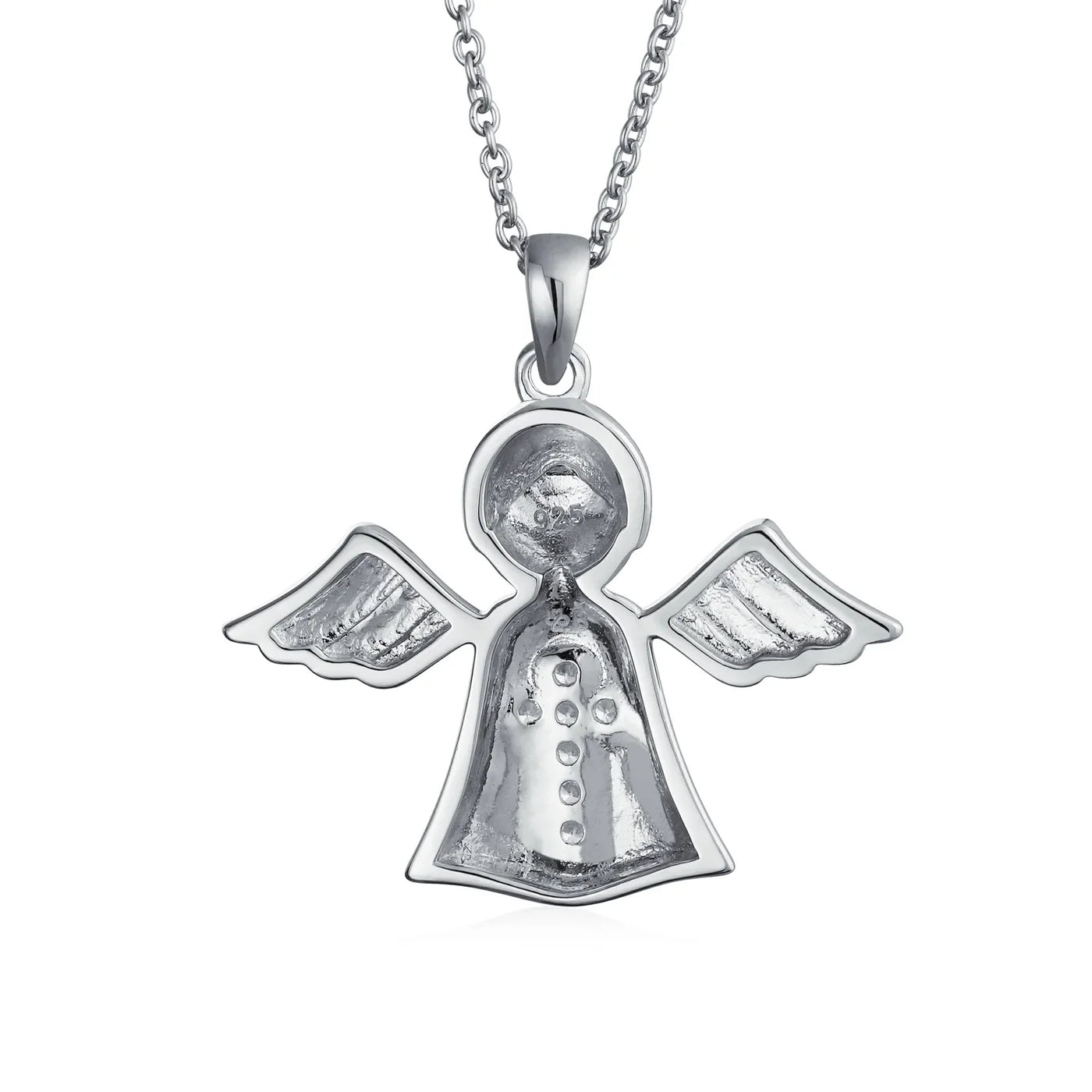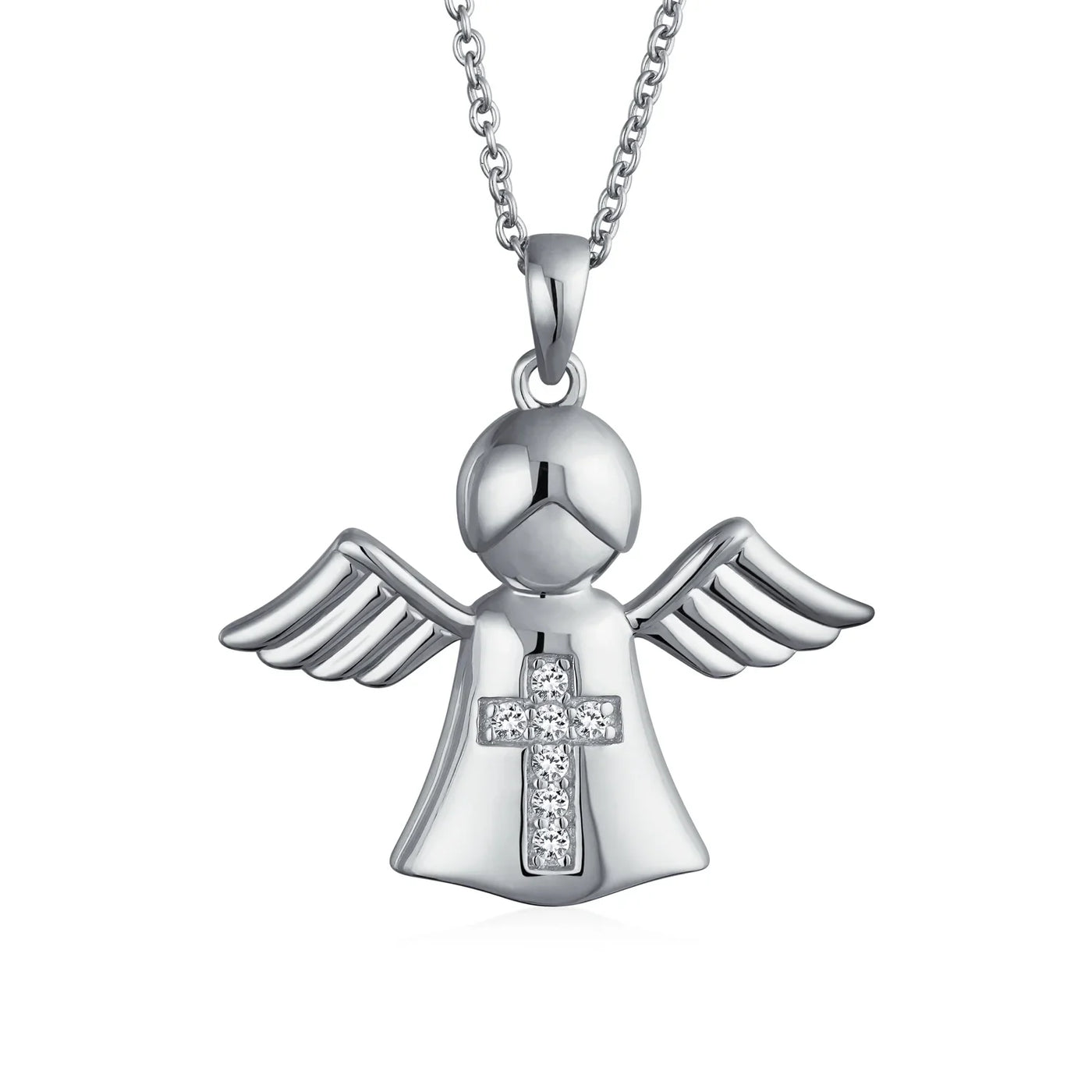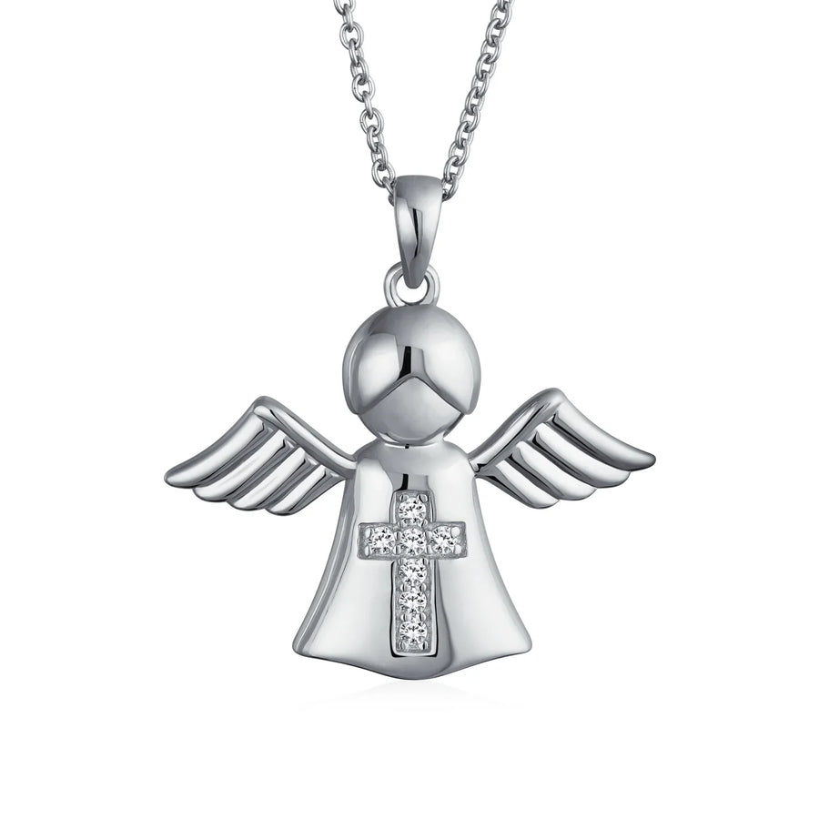 - Looking for a gift that will be cherished and valued for years. Buy this stunningly gorgeous guardian angel cross pendant for your sweet little angel. This alluring and marvelous silver cross pendant for little ones is forged out of .925 Sterling Silver and was crafted with a rhodium finish for a brilliant shine that will resist tarnish for years. This cross pendant features intricately machine carved detailing in the design of the beautiful smiling guardian angel with expansive wings. A pave CZ encrusted cross in the center of this angel cross pendant necklace adds the right amount of sparkle and flair to this lovely piece of jewelry. This CZ cross pendant makes a fantastic gift and can be worn for any occasion.