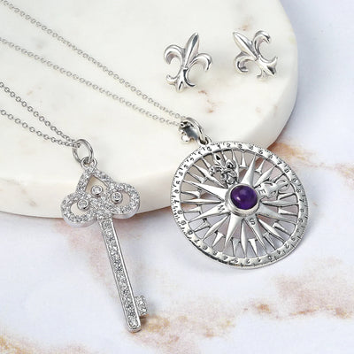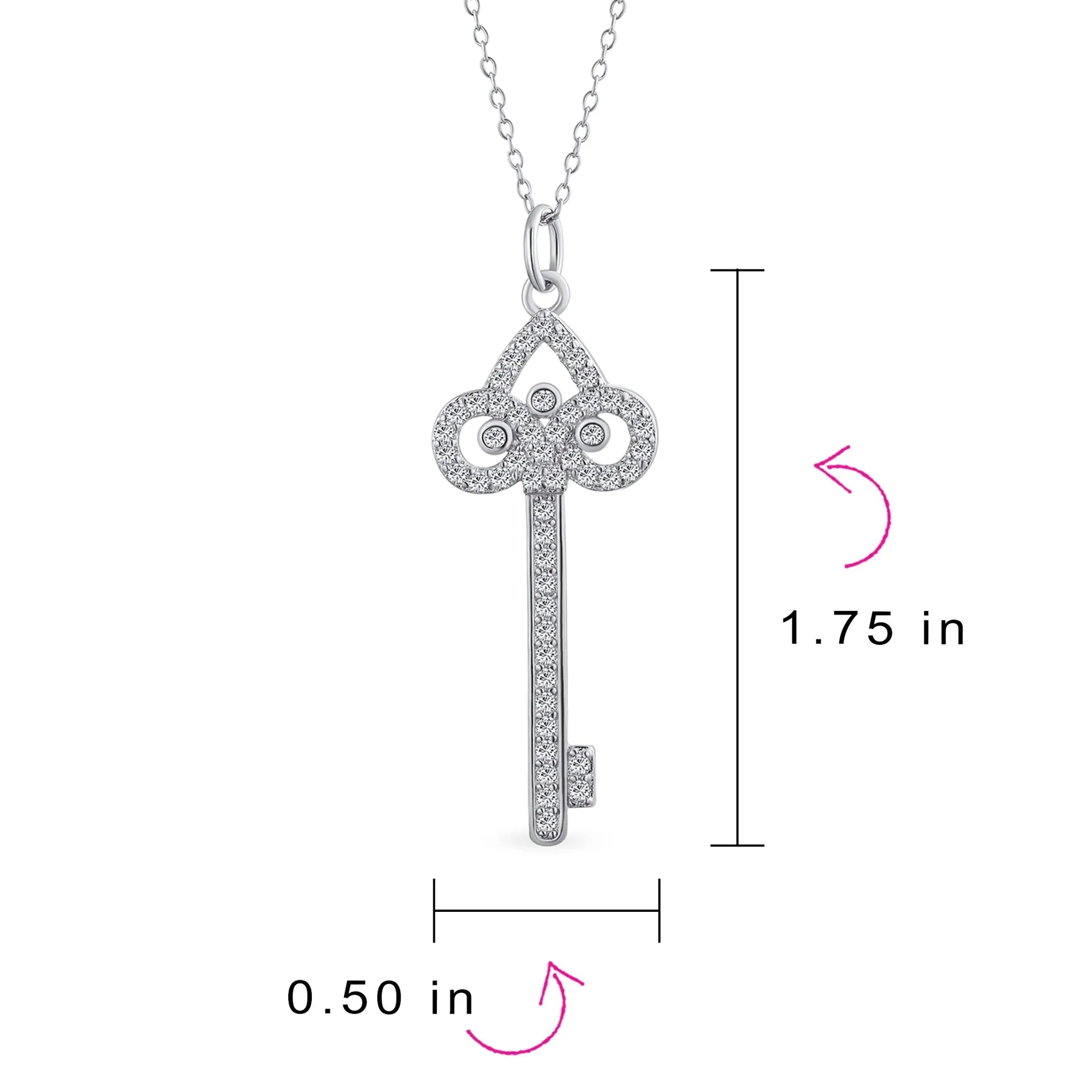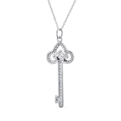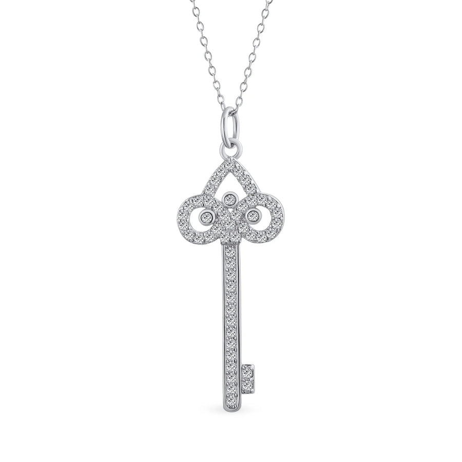 - Unlock your inner dominatrix with this stunning .925 Sterling Silver key pendant. Rhodium plated to resist tarnish, it features a Fleur de Lis crown design. Accented with sparkling Cubic Zirconia stones, it offers a glamorous look. Comes with an 18-inch chain, making it an elegant necklace . Perfect for classic evening attire or as a special gift.