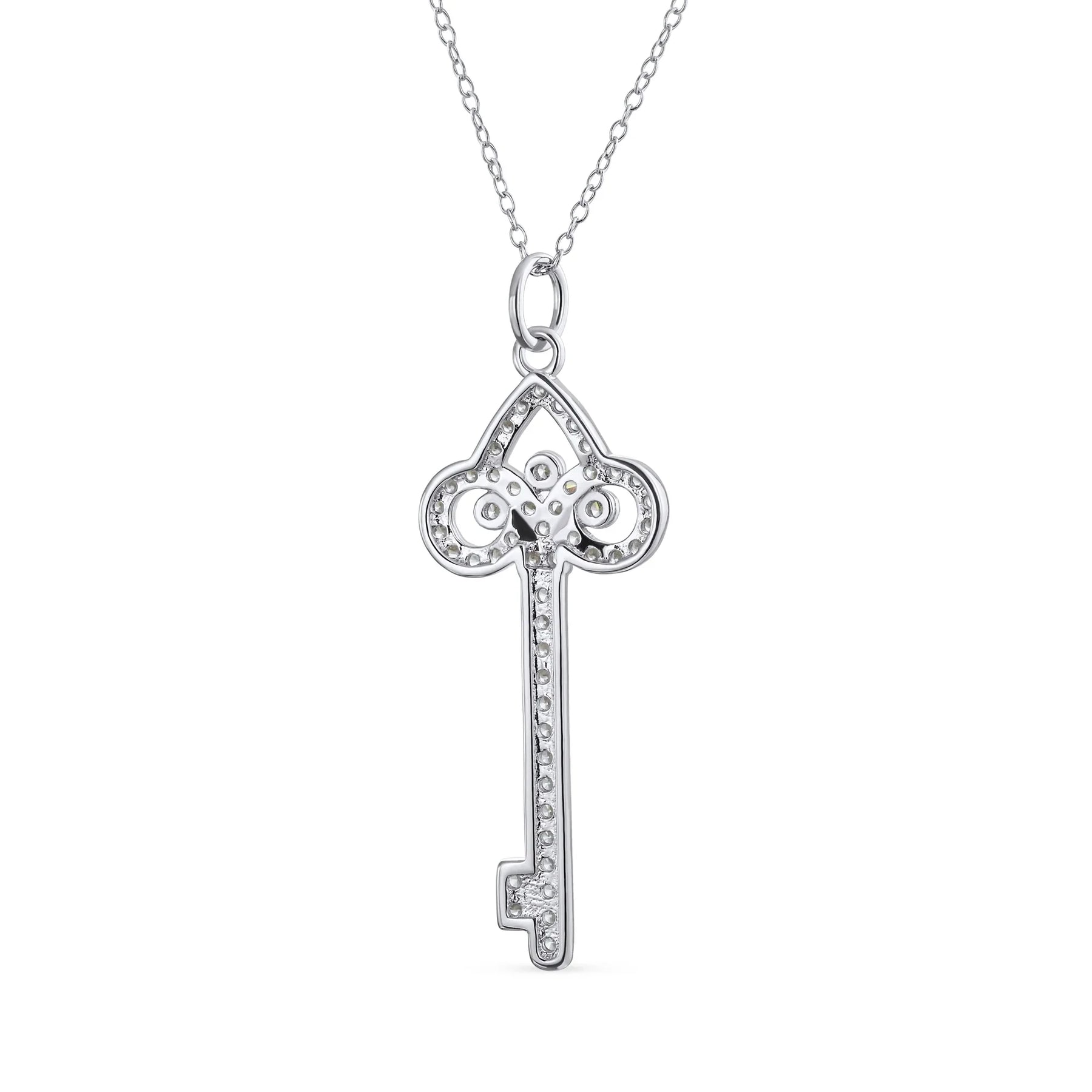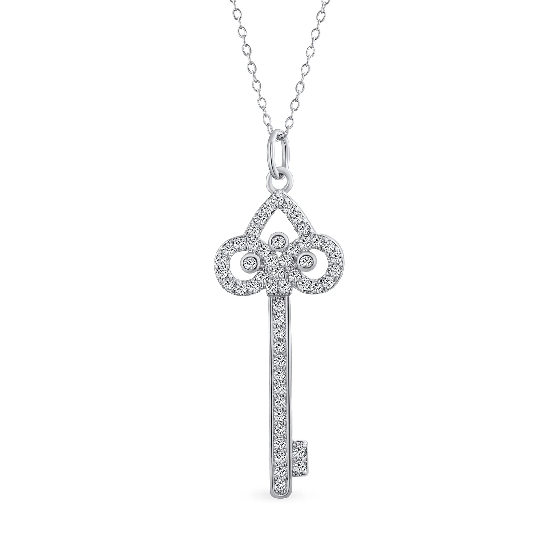 - Enhance your wardrobe effortlessly with this rhodium-plated jewelry. Featuring a pave CZ adorned, cut-out skeleton key pendant, this fleur-de-lis inspired necklace on an 18-inch chain makes a perfect gift.