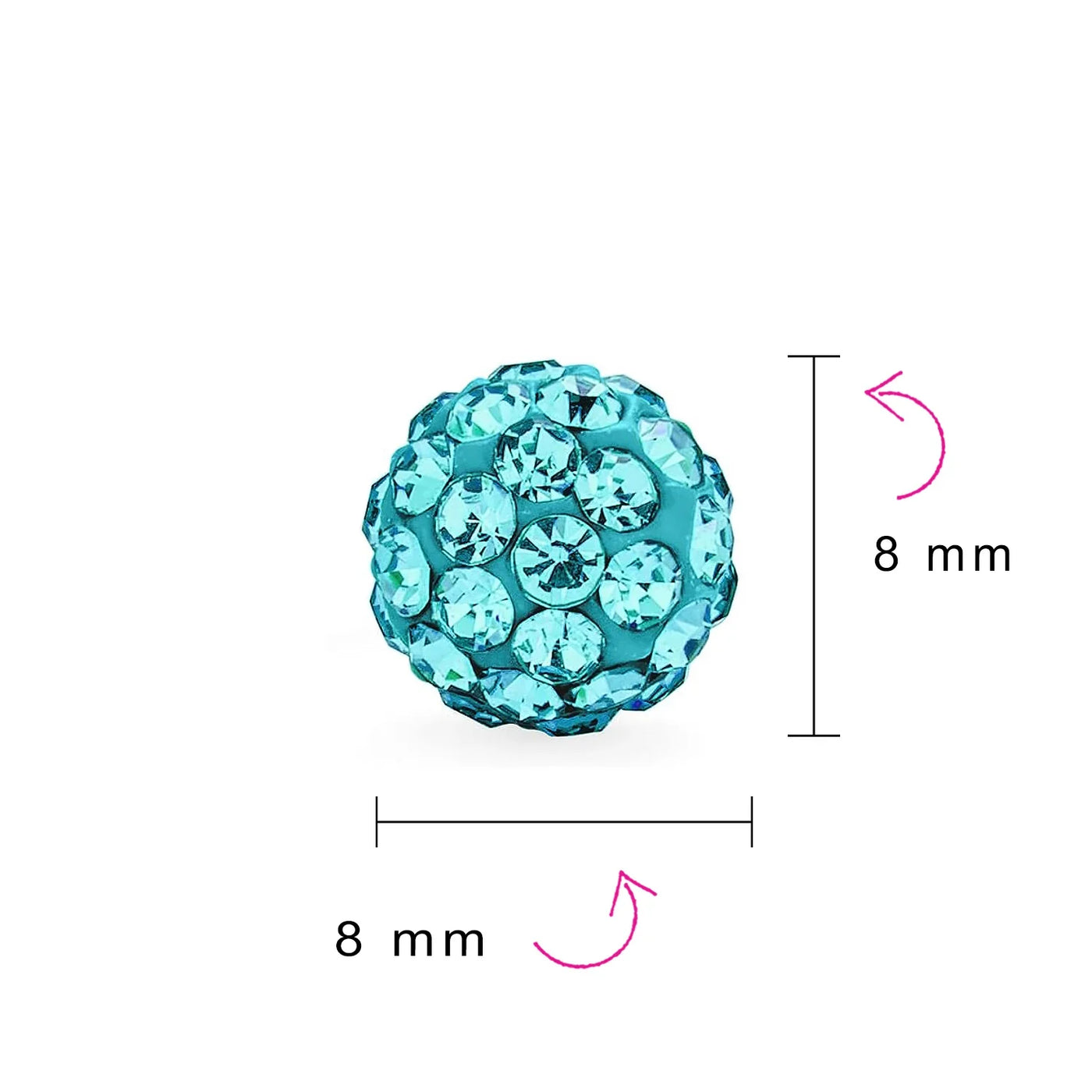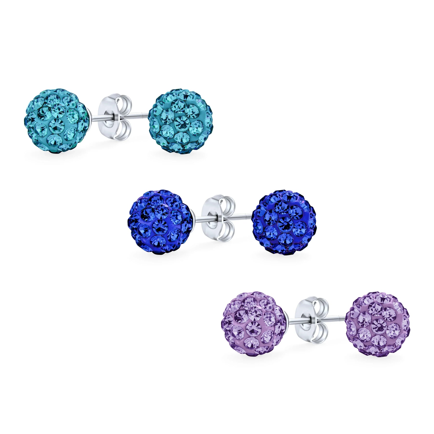 Set of 3 Multi Colors Crystals Ball Stud Earrings Sterling Silver 8MM