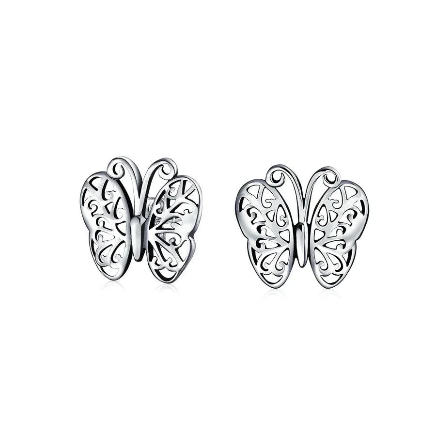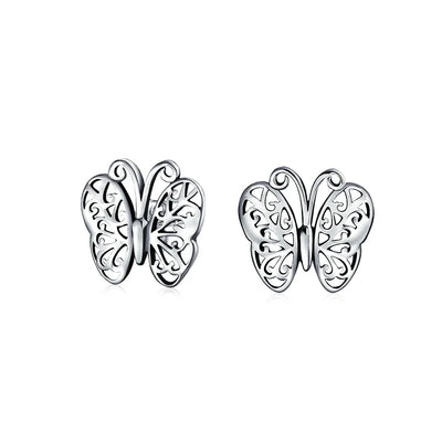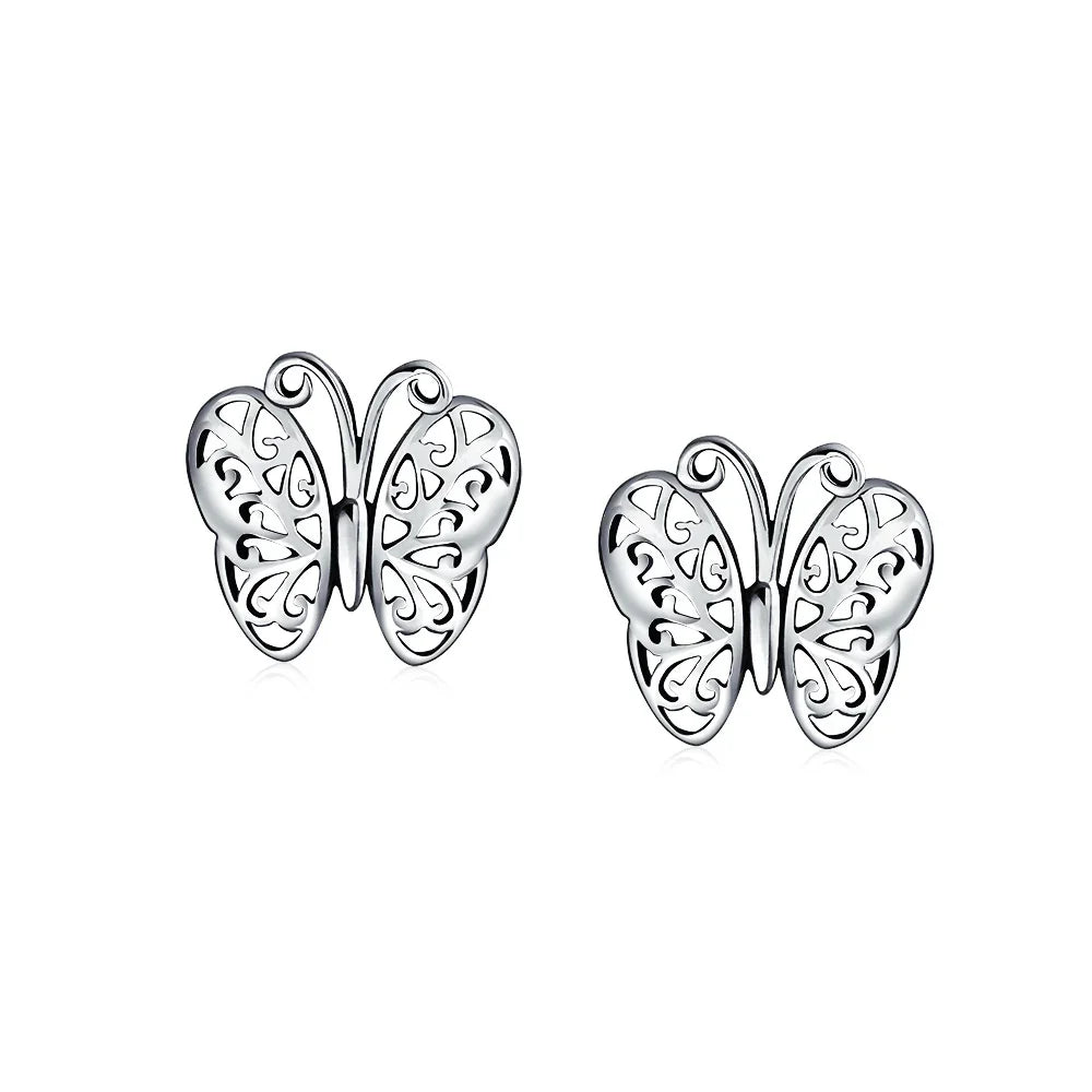 - Elevate your style with these chic sterling silver butterfly earrings. Ideal for women of all ages, they feature a delicate design. The open filigree wings add sparkle and radiance to any outfit. Perfect for special occasions or everyday wear, these earrings are a hit among animal lovers. Lightweight and comfortable, they secure with a post backing. Explore our coordinating sterling silver butterfly jewelry collection to complete your look.