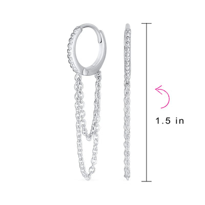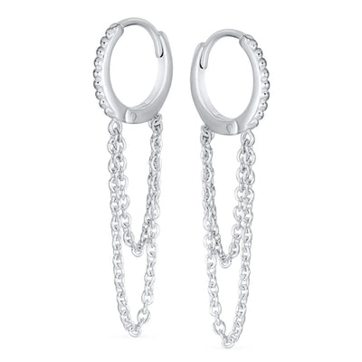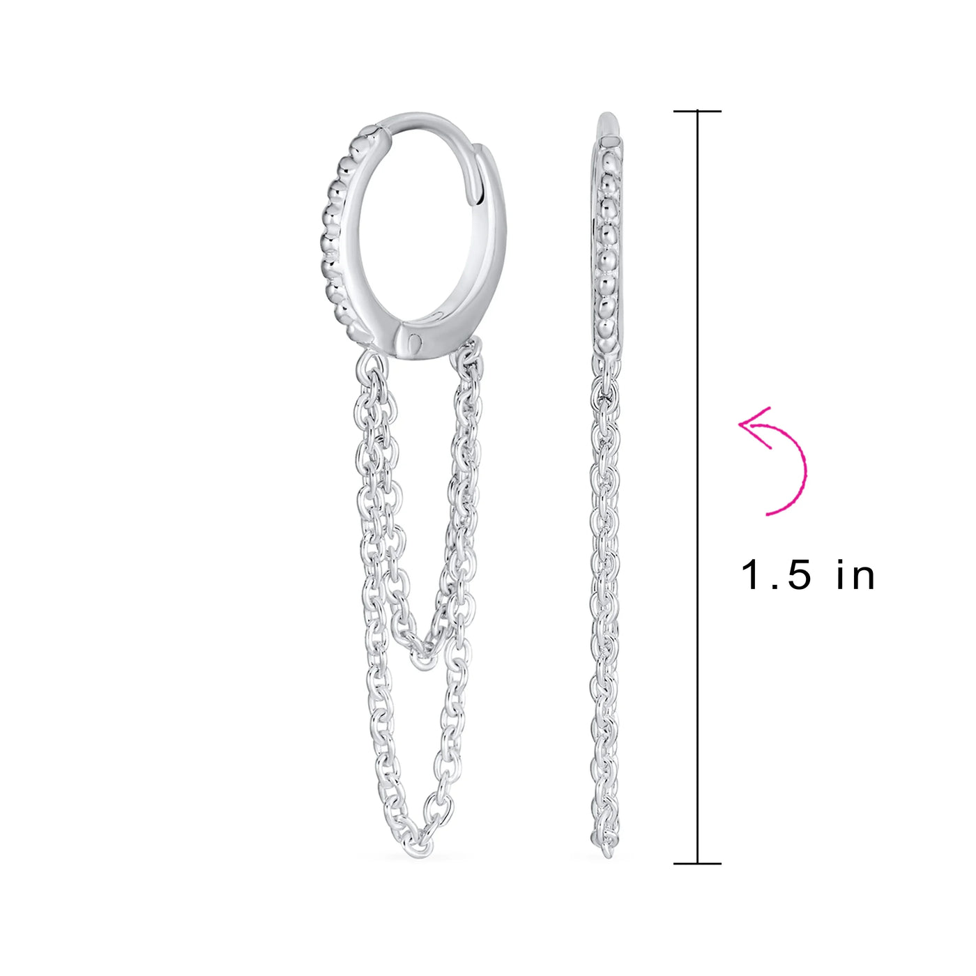 - For a sleek, modern twist on a hoop earring with a cool urban feel, chains dangling from the front to the back on this small cz edged hoop for extra sparkle.