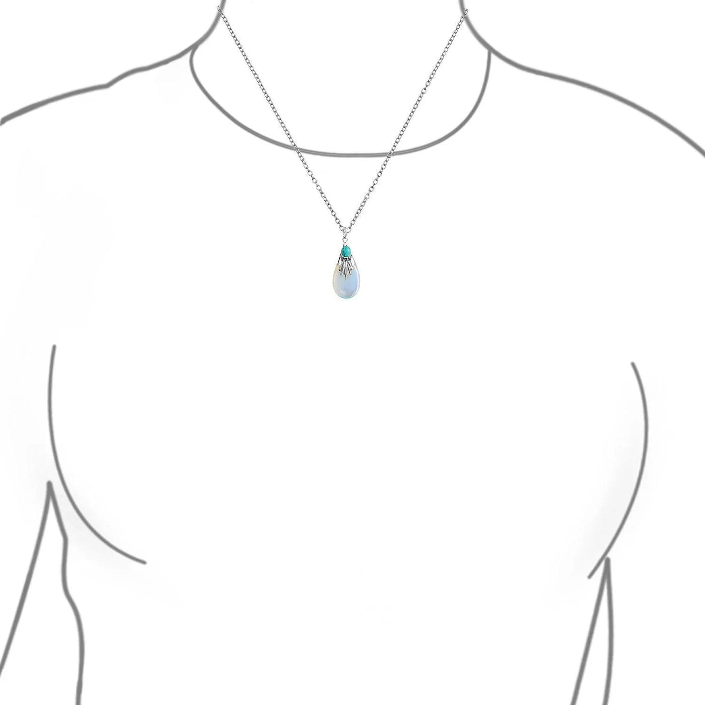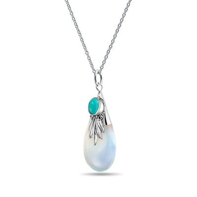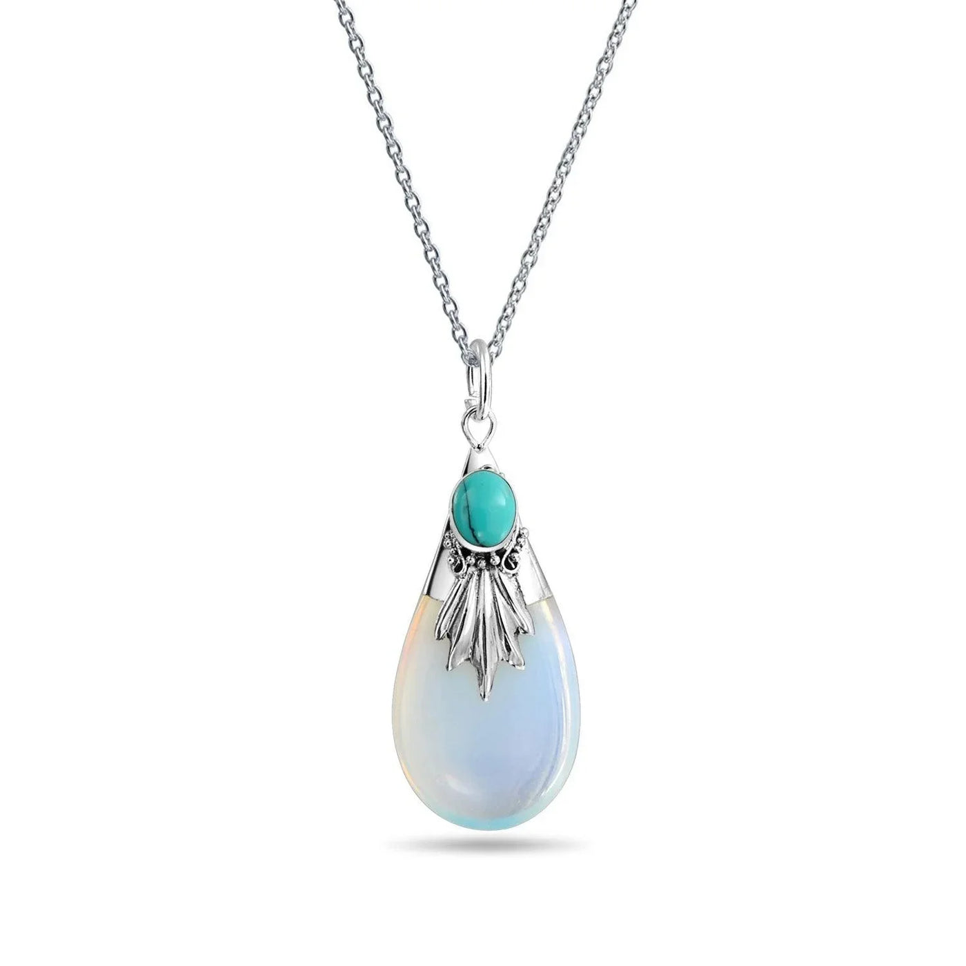 - Perfect for everyday wear, this chic pendant showcases a milky teardrop Opalite in a stylish, fashionable way. Enhance any look, day or night, with our new Opalite glass pendant necklaces. The iridescent Opalite teardrop is topped with a 5mm Stabilized Turquoise stone in a .925 Sterling Silver Bali style setting. Elevate your style with a .925 Sterling Silver December pendant necklace this season. A splash of blue jewelry perfectly complements any neutral ensemble. The eye-catching detail of our Opalite glass pendant is a sensational addition to your jewelry box.