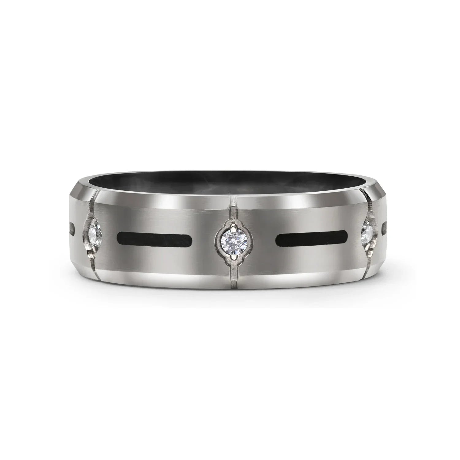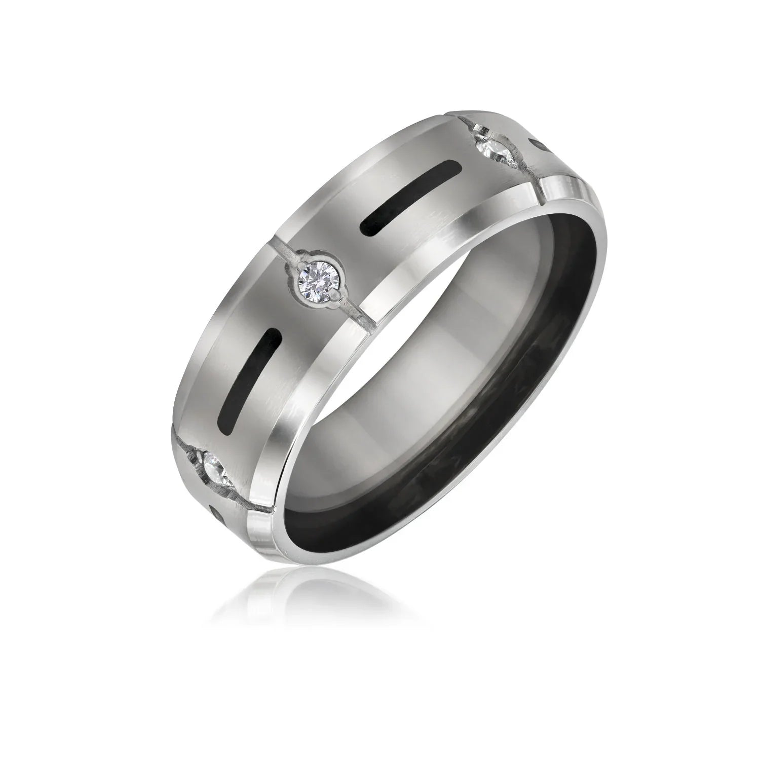 - A stunning men's titanium Wedding Band with resin inlay and eight cubic zirconia stones. This modern 8-stone ring updates the traditional gold band. The brushed center and polished bevel edge create a stylish, simple design. Unisex cubic zirconia rings are perfect for matching Wedding Bands. Enter your marriage as a complementary pair with these 7mm titanium rings.