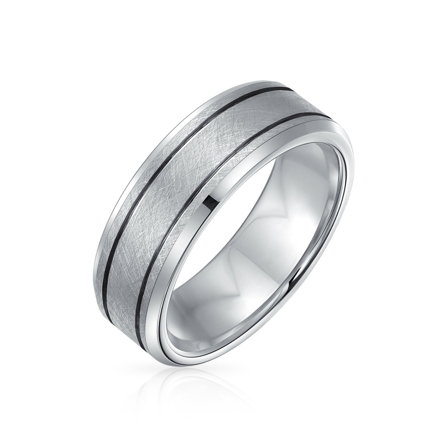 - 7MM MODERN WEDDING BAND - Sleek grey men's ring with a comfort fit shank, featuring a classic double-grooved beveled design. High-polished finish, available in sizes 8 to 14, ideal for daily wear.