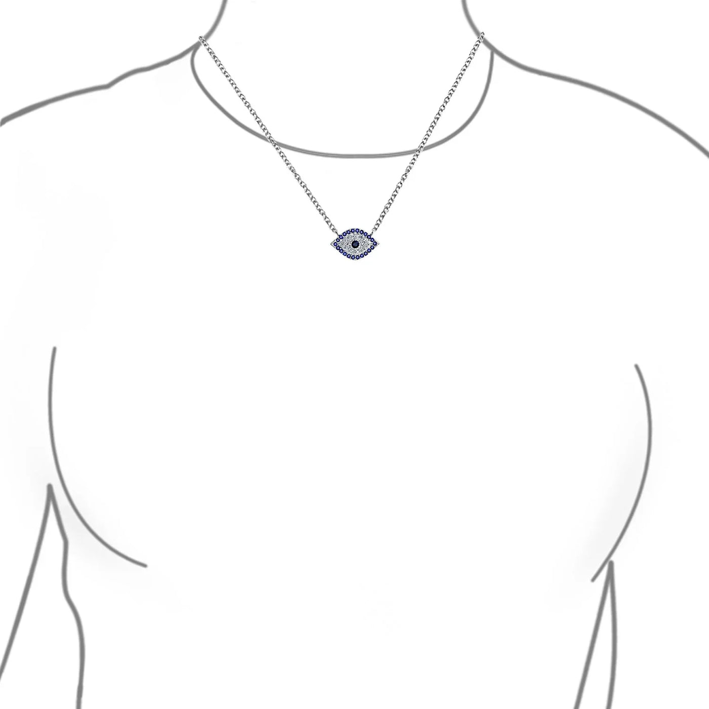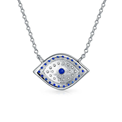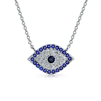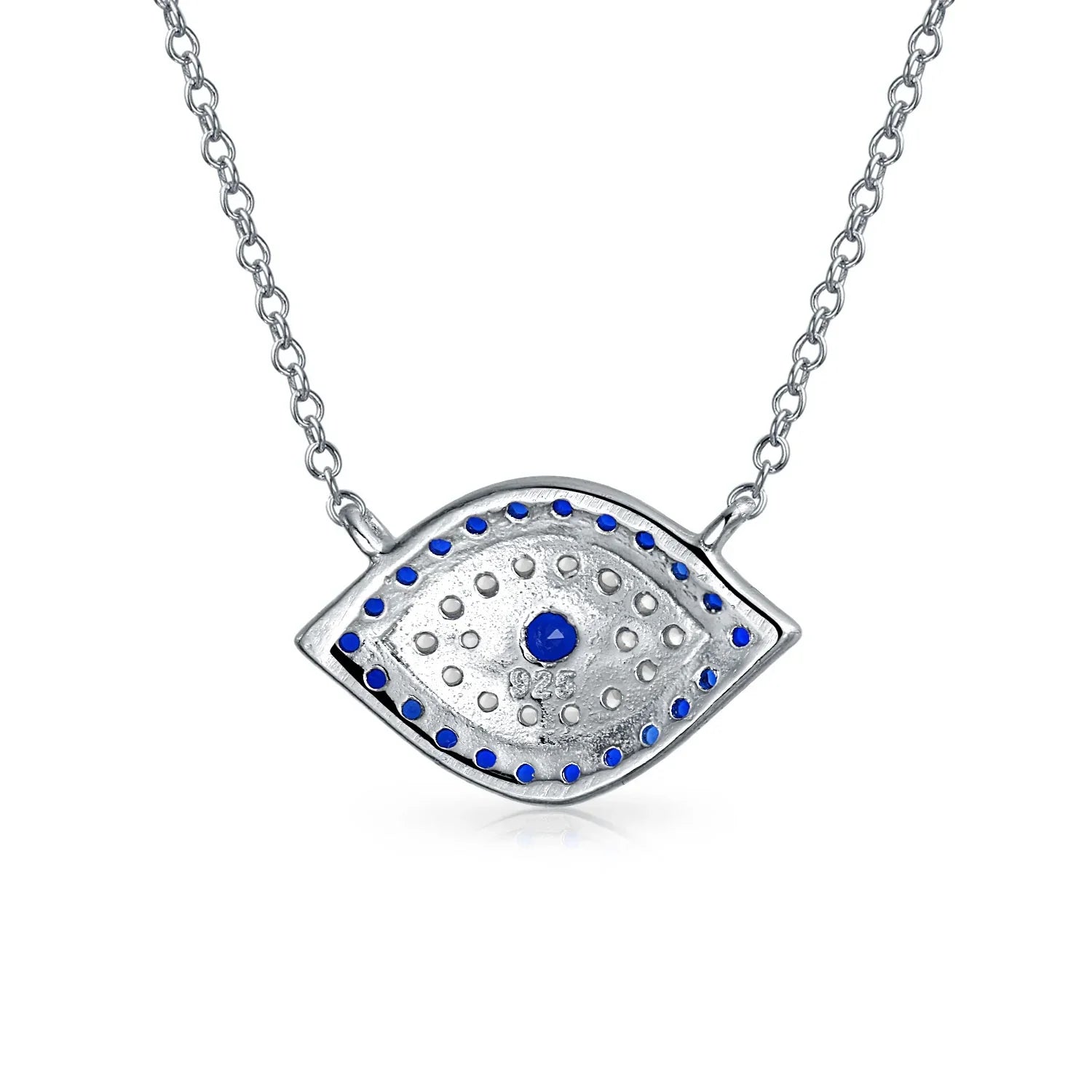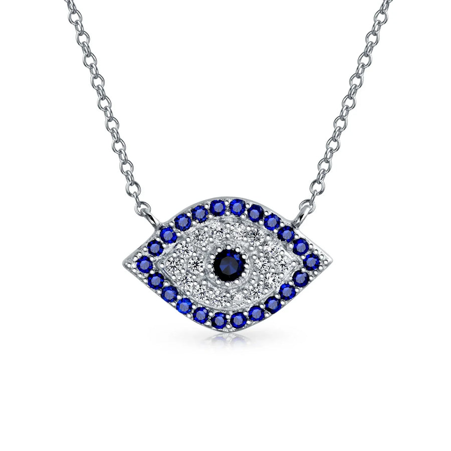- Ward off bad juju with this charming evil eye necklace. Crafted from .925 Sterling Silver, it features blue and white Cubic Zirconia. This dainty evil eye design is a perfect good luck charm. Ideal gift for September birthdays, unique and fun. The evil eye symbolizes protection and good fortune. Don't miss out on this good luck pendant necklace . Purchase your own today!
