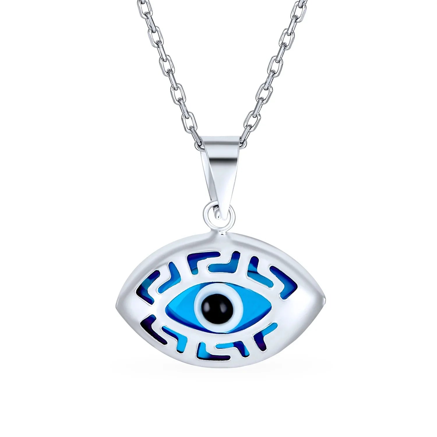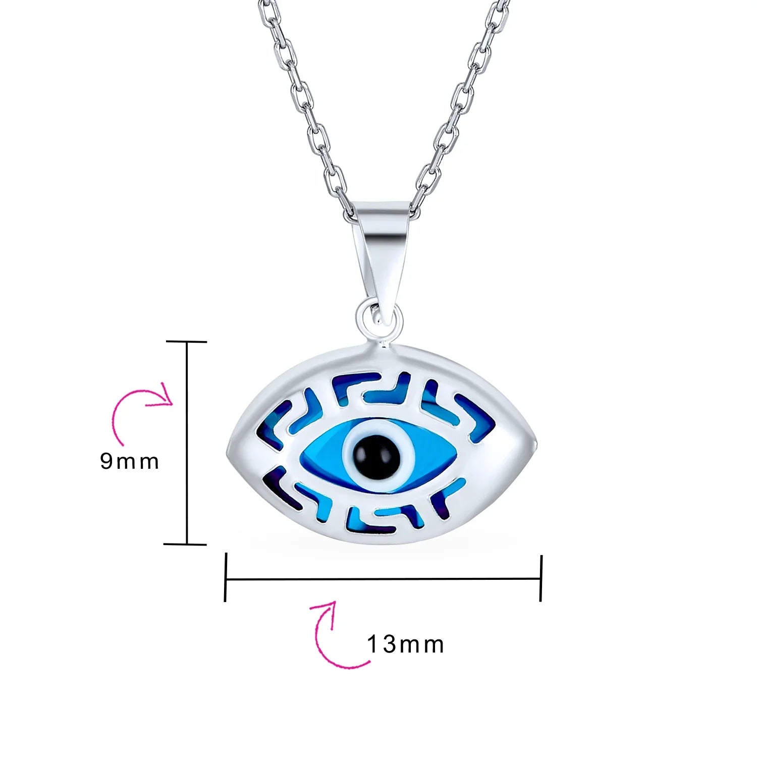 - Ward off evil spirits with our round evil eye glass pendant. Adorned with .925 Sterling Silver filigree, it fits any chain. Celebrate heritage and good vibes. rolo chain included.
