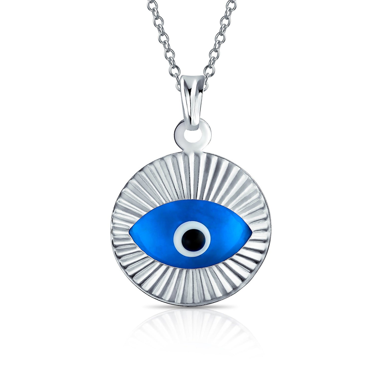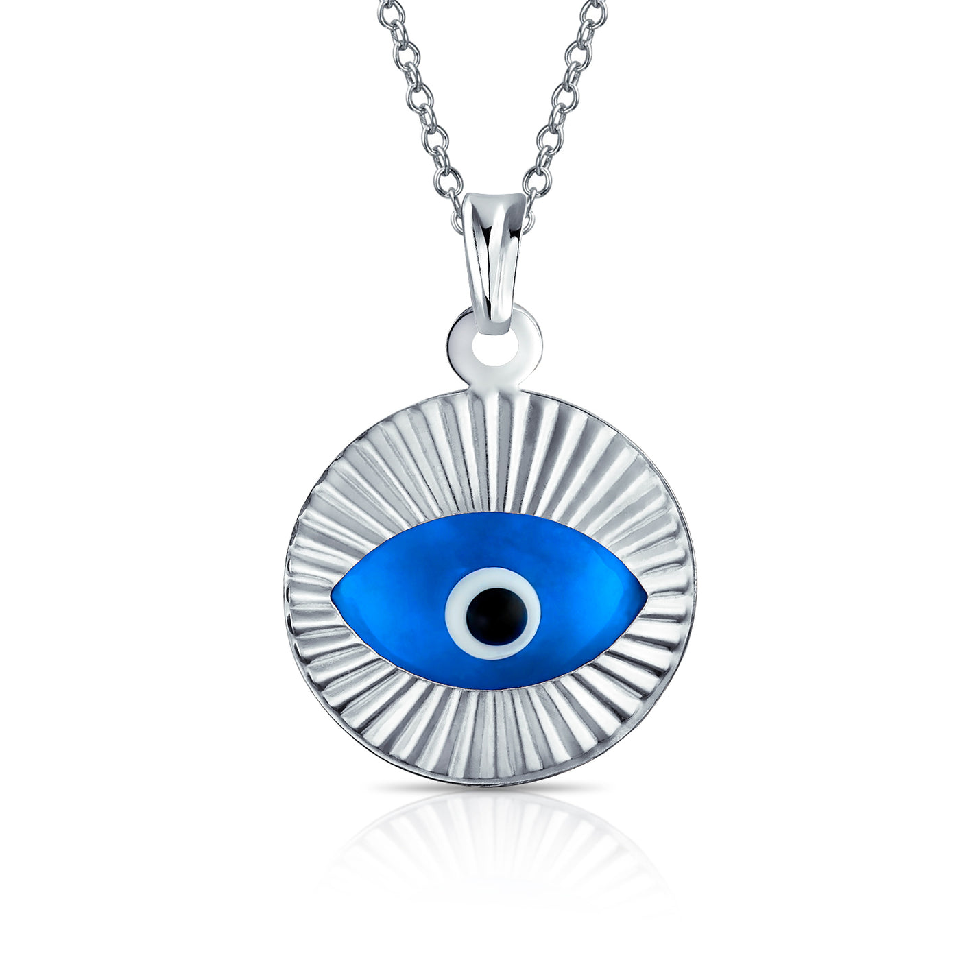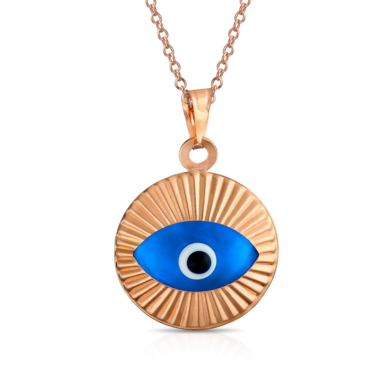 - Our moving sterling silver evil eye pendant features a vibrant blue and black glass evil eye. This bold piece of evil eye protection jewelry is magical, hypnotic, and beautiful to look at. These plated in rose gold or silver evil eye pendant make great birthday gifts for those whom you want to bring luck and protection. The rolo chain is not included.
