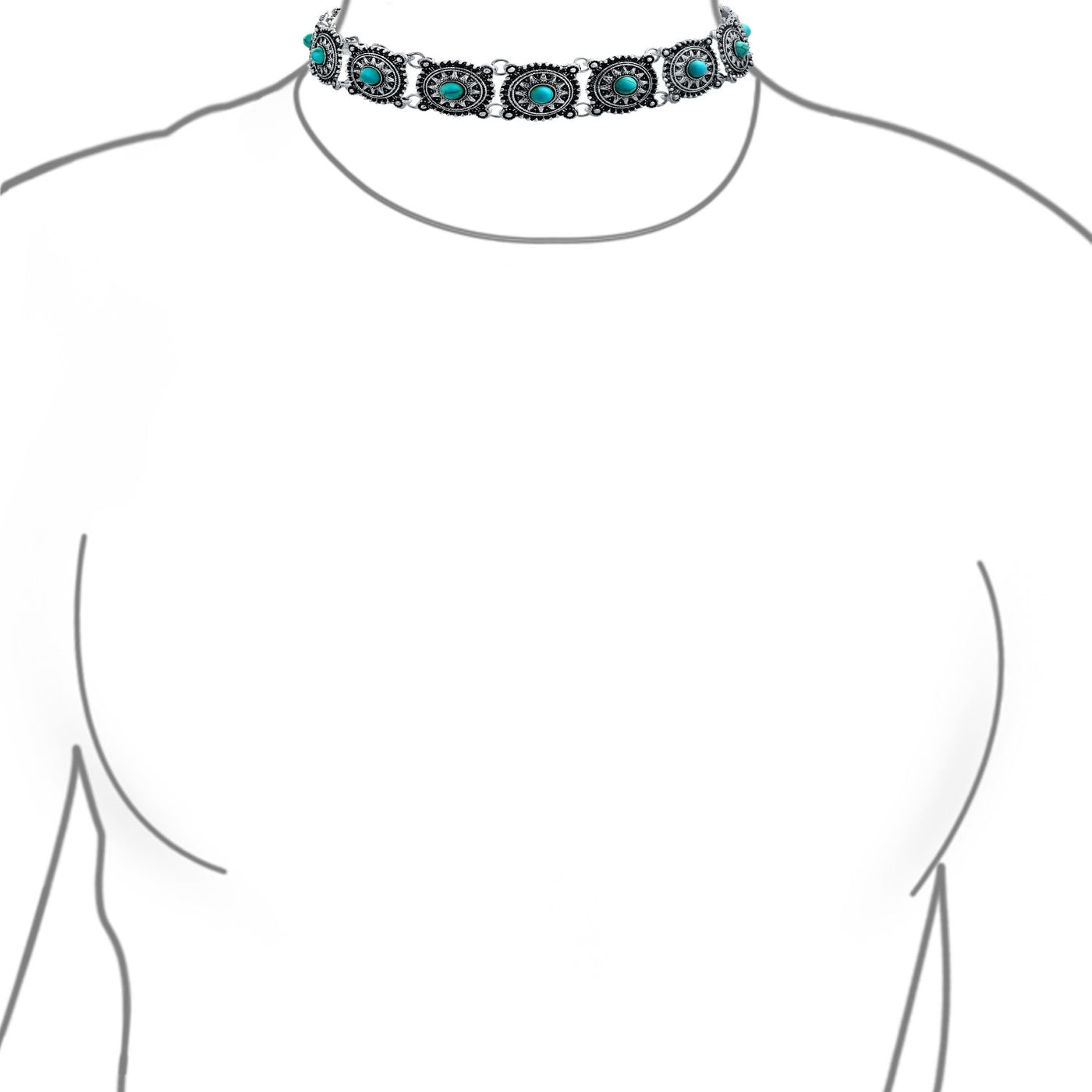 Falls perfectly around the base of the neck like a collar. On a petite woman it will hit your collarbone while for plus size women it might feel more like a choker.