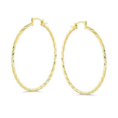 - Every lady needs her go to pair of hoops to add alluring zest to any ensemble. These divine 18k Gold Plated hoop earrings are shining and have a tantalizing twisting pattern.